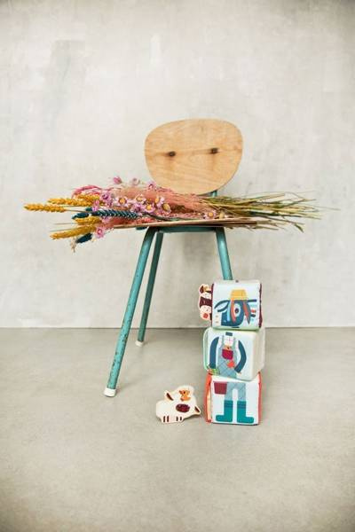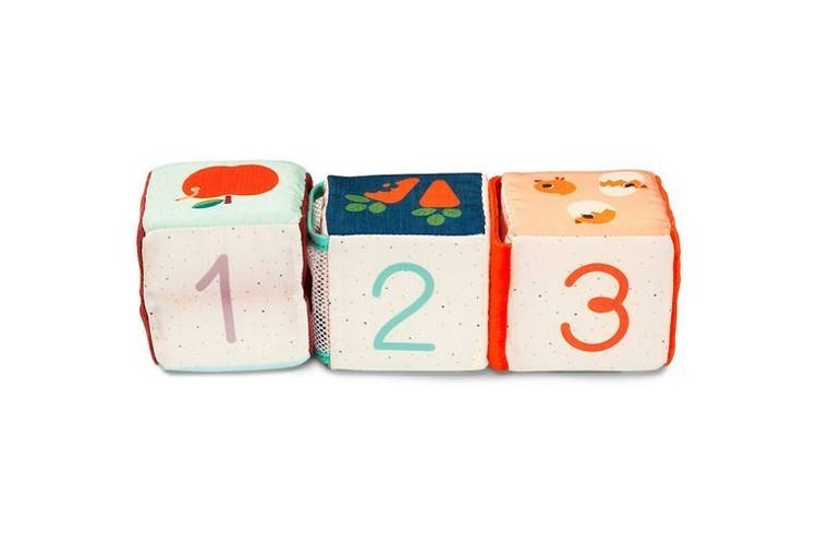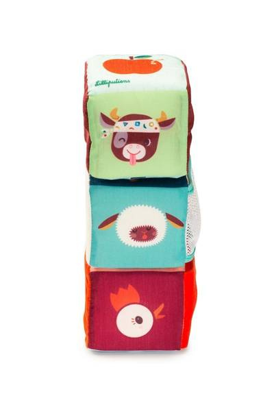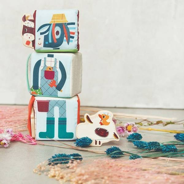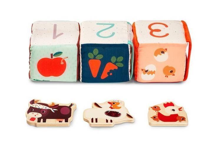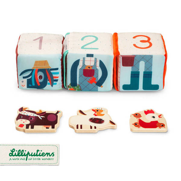 Zestaw 3 kostek aktywizujących z kolekcji Farma belgijskiej marki Lilliputiens to niebanalne, miękkie i wielofunkcyjne źródło rozrywki i nauki dla ciekawskich maluszków. Na każdym z boków każdej kostki znajduje się inne wyzwanie, m. in.: cyfry od 1 do 3, które trzeba posegregować w odpowiedniej kolejności, postać Osiołka Ignace'a do ułożenia jak puzzle czy kieszonki lub schowki, w których należy ukryć dołączone do zestawu drewniane figurki – krówkę Rosalie, owieczkę Yvonne oraz kokoszkę Paulette – odpowiednio na kostce z ich podobizną. Kostki zostały uszyte z materiałów o różnych wzorach i fakturach, są solidnie wykonane i w pełni bezpieczne. Zaskakują i pobudzają dziecięcą wyobraźnię. Rozwijają koordynację ręka-oko i małą motorykę (chwytanie, ciągnięcie, wkładanie, wyciąganie), aktywizują zmysł słuchu (jedna z kostek grzechocze, inna szaleści), wzroku i dotyku, uczą liczenia do 3, a poprzez zabawę w chowanie – dostrzegania związków przyczynowo-skutkowych.