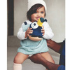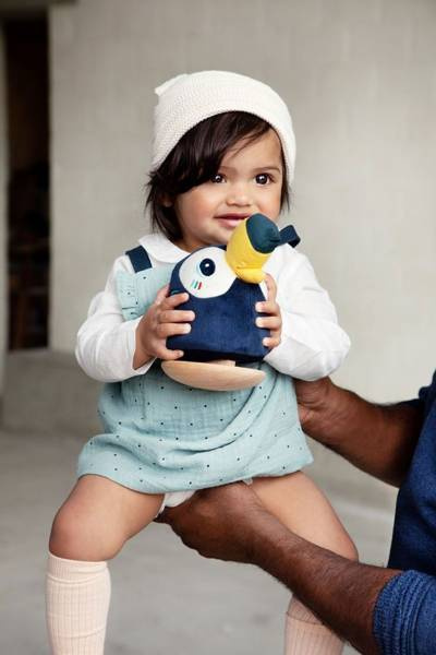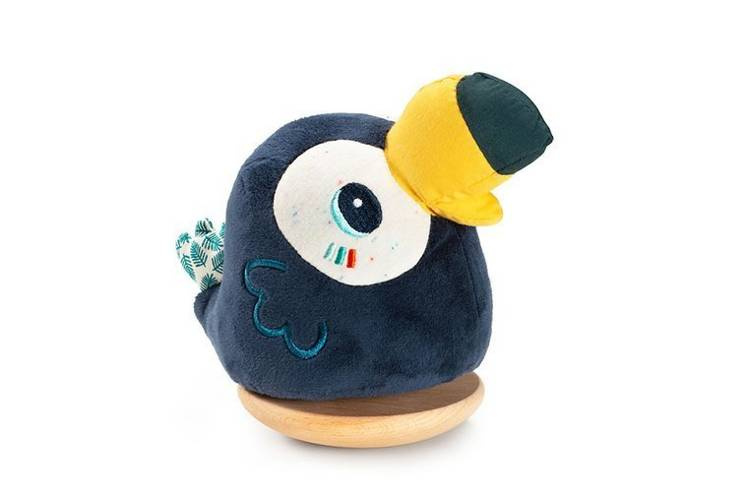 Wańka-wstańka Tukan Pablo belgijskiej marki Lilliputiens to niebanalne, miękkie i wielofunkcyjne źródło rozrywki dla maluszków. Uroczy pluszowy Tukan Pablo uszyty jest z materiałów o różnych wzorach i fakturach, a potrząsany – dzwoni. Przytulankę można nałożyć na drewniany podest, zaokrąglony od dołu, dzięki czemu buja się ona delikatnie na boki (czemu również towarzyszy dźwięk dzwoneczka), powracając niezmiennie do pozycji pionowej. Na elemencie, który wsuwa się od spodu w pluszaka znajduje się grafika wykluwającego się z jajka malutkiego tukana. Zabawka jest solidnie wykonana i bezpieczna. Zaskakuje i pobudza dziecięcą wyobraźnię. Rozwija małą motorykę (chwytanie, potrząsanie, wkładanie, wyciąganie, tulenie, bujanie), aktywizuje zmysł słuchu (dzwoni), wzroku i dotyku.