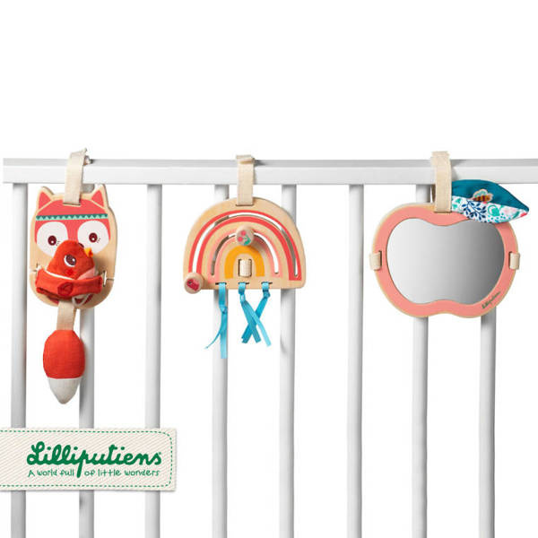 Zestaw 3 zawieszek aktywizujących z kolekcji Lisiczka Alice belgijskiej marki Lilliputiens to niebanalne zabawki z naturalnego drewna, angażujące dziecko na wiele godzin. W skład zestawu wchodzą: drewniana lisiczka Alice z długimi łapkami, w których trzyma pluszowego szeleszczącego ptaszka oraz miękkim ogonem-grzechotką, drewniana tęcza z dwoma torami z klockami (po 1 na każdym) do przesuwania oraz trzema tasiemkami sensorycznymi, a także drewniane jabłuszko z lusterkiem i tekstylnym listkiem z naszywką pszczółki. Zawieszki posiadają rzepy do mocowania, np. do pałąka w wózku, nosidełku, foteliku samochodowym, macie czy do barierki łóżeczka. Zabawka jest solidnie wykonana i w pełni bezpieczna. Rozwija koordynację ręka-oko, małą motorykę (chwytanie, potrząsanie, przesuwanie, ugniatanie), aktywizuje zmysł słuchu (szeleści, grzechocze), wzroku (lusterko) i dotyku.
