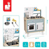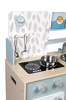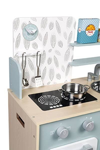 Drewniana kuchnia Plume francuskiej marki JANOD sprawi mnóstwo radości każdemu dziecku. Pozwoli mu ona bezpiecznie uczestniczyć w codziennych czynnościach i rozwijać pasję gotowania. Urocza kuchenna zabudowa na nóżkach utrzymana jest w kolorach jasnego drewna, błękitu, bieli i szarości. Posiada okrągły, metalowy zlew, dwa „elektryczne” palniki, otwierany piekarnik z dwoma pokrętłami, dolną szafkę z drzwiczkami, dwie otwarte górne półki, a na tylnej ścianie (białej z oryginalnym wzorem w szare pióra) – wieszak z 3 haczykami i zegar. Do zestawu dołączone są ponadto akcesoria: metalowy garnek, łyżka do makaronu i szpatułka oraz 2 kartoniki-produkty spożywcze (makaron i ser). W bocznych ściankach mebel ma wygodne otwory do przenoszenia. Dzięki sporym rozmiarom i wielu akcesoriom zabawką może się bawić jednocześnie więcej niż jedno dziecko.