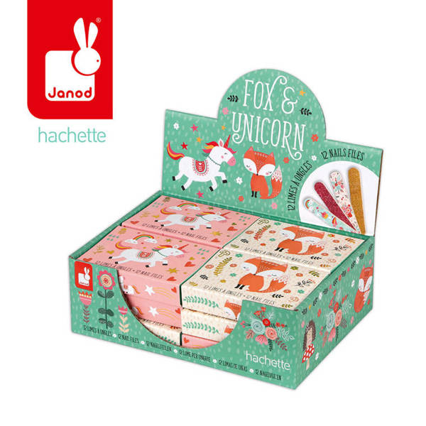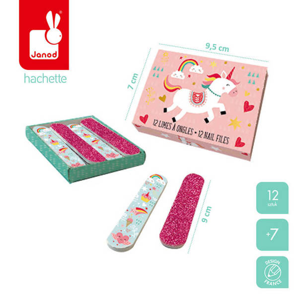 Zestaw 12 mini pilniczków do paznokci z serii akcesoriów papierniczych francuskiej marki JANOD to urokliwy dodatek z motywem śpiącego liska lub radosnego jednorożca do wyboru, utrzymany w delikatnej kolorystyce: odcieniach różu, bieli i turkusu z brokatowymi elementami. Poręczne nieduże pilniczki z solidnego kartonu ułatwia samodzielne dbanie o estetykę dłoni, ale też – doskonale się nadają do zabawy w naśladowanie dorosłych zachowań. Zaprojektowany we Francji. Idealnie nadaje się na prezent.