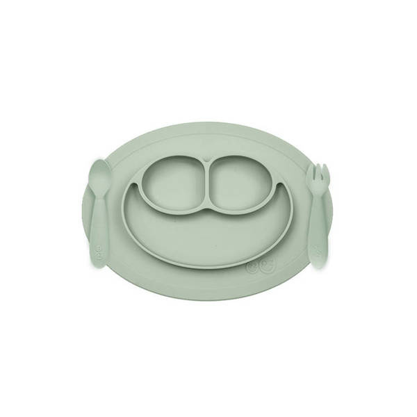 Mini Mat to nieduża, poręczna podkładka i trójdzielny talerzyk w jednym. Pasuje do większości blatów krzesełek do karmienia. Innowacyjna silikonowa podkładka mocno przywiera do stołu czy innej gładkiej powierzchni. Dzięki temu małe dziecko nie jest w stanie jej przesunąć czy zrzucić. Ma owalny kształt, estetyczny wygląd i kolor. Trójdzielny talerz pozwala dzielić posiłki na porcje, co ułatwia naukę samodzielnego jedzenia, a z czasem także – rozpoznawanie kategorii pokarmów. Pomaga też rodzicom podawać dania, złożone z odpowiedniej ilości różnego rodzaju składników. Pojemność talerzyka to idealne dziecięce porcje: 2 razy 60 ml i 120 ml. Radosny wygląd – mniejsze przegródki przypominają kształtem oczy, a większa uśmiech – sprawia, że pory posiłków kojarzą się pozytywnie.