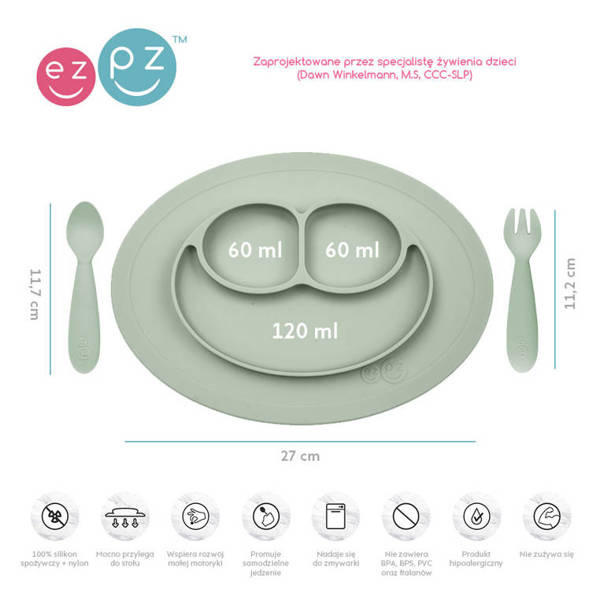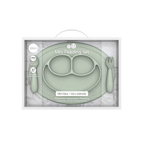 Komplet Mini Feeding Set amerykańskiej marki EZPZ (czyt. izipizi) to idealny zestaw naczyń do nauki samodzielnego jedzenia dla Twojego maluszka. Przeznaczony jest dla dzieci od 12. miesiąca życia i dla ułatwienia prawidłowego rozszerzania diety (w zależności od zaleceń lekarza pediatry). Został on zaprojektowany przez specjalistę w dziedzinie logopedii i żywienia dzieci, stąd wielkość i kształty elementów zestawu są idealnie dopasowane do ust i potrzeb małego dziecka, wspierają one rozwój aparatu mowy i małej motoryki u dziecka, stanowią doskonałe narzędzie rozwojowe oraz pomoc w komponowaniu zbilansowanych posiłków.