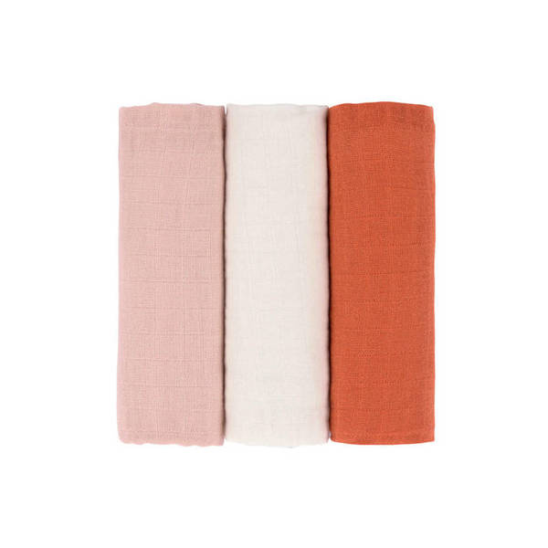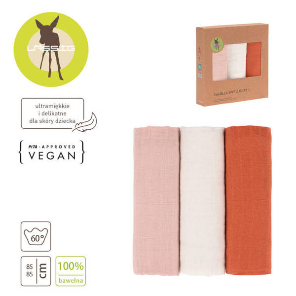 Komplet trzech wielofunkcyjnych otulaczy z wegańskiej bawełny niemieckiej marki LASSIG: jeden rdzawy, drugi mlecznobiały oraz trzeci – w pudrowym odcieniu różu. Mogą być używane do owijania maluszka, jako pieluszka do odbijania po karmieniu, kocyk na lato, prześcieradło czy kocyk do wózka, chusta do karmienia piersią, ochrona przed słońcem i na wszelkie inne sposoby według potrzeb. Są jednowarstwowe, lekkie, przewiewne, oddychające i delikatne dla skóry. Zapewniają doskonałą wentylację i komfort. Dzięki kompletowi 3 sztuk w rozmiarze 85 na 85 cm rodzic ma potrzebny otulacz zawsze pod ręką.