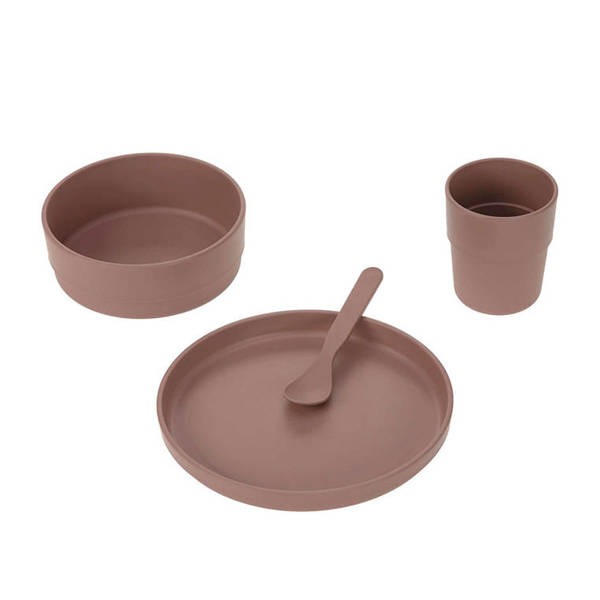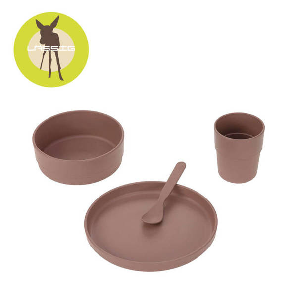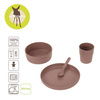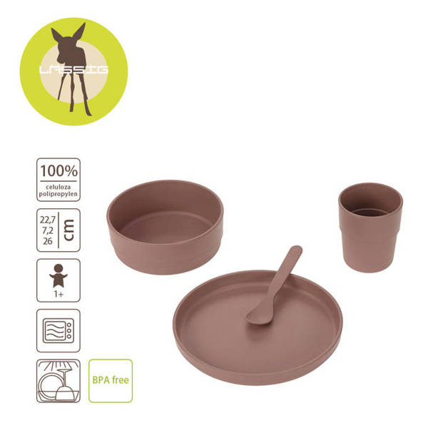 Komplet pięknych, minimalistycznych naczyń z kolekcji Uni niemieckiej marki LASSIG. W jego skład wchodzi dziecięcy talerz, miska, kubek i łyżeczka – wszystkie elementy utrzymane w jednolitym czekoladowym odcieniu brązu, z matowym wykończeniem. Zestaw jest wykonany z tworzywa, będącego mieszanką polipropylenu i celulozy, dzięki czemu jest ono bardziej ekologiczne i przyjazne dla środowiska i zasobów, niż klasyczny polipropylen. Naczynia z tego materiału są nie tylko trwałe, wolne od BPA i bardzo lekkie, ale można je również myć w zmywarce i używać w kuchence mikrofalowej.