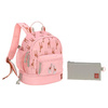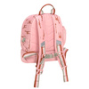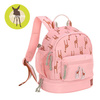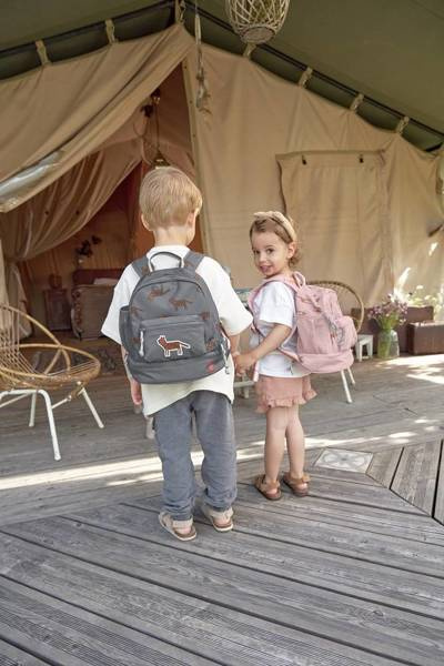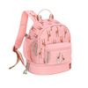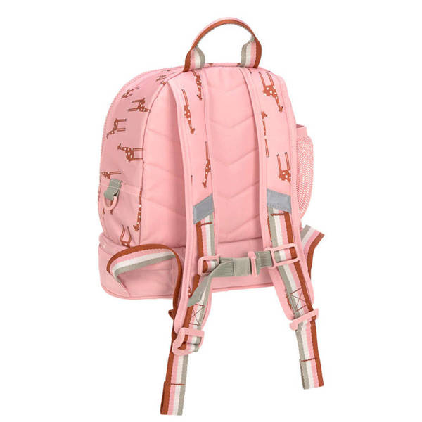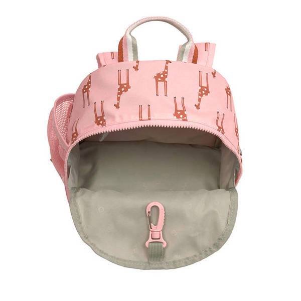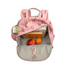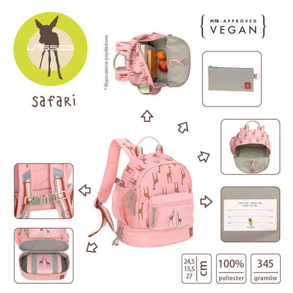 Funkcjonalny, uroczy plecak niemieckiej marki LASSIG. Sprawdzi się zarówno do przedszkola, jak i podczas wycieczek. Jest lekki i wygodny. Zwraca uwagę niebanalnym designem – jest różowy z motywem rudobrązowych żyraf (multiprint na komorze głównej i naszywki na przedniej kieszeni) oraz pasiastą rączką i paskami przy ramiączkach. Przy suwakach ma kontrastowe szare ozdobne sznureczki. Posiada pojemną komorę główną. Wewnątrz niej znajduje się różowy karabińczyk, np. do zawieszenia kluczy lub dołączonej do plecaczka saszetki-piórnika w kolorze szarym oraz okienko z wizytówką, na której można zapisać imię dziecka i numer kontaktowy rodzica. Wnętrze ma także solidną szarą podszewkę. Z przodu plecaczka znajduje się mniejsza kieszeń na suwak, a na jego spodzie – dodatkowa, pojemna komora – również na suwak – w której z łatwością zmieści się pudełko na lunch czy obuwie na zmianę. Boczna kieszonka z siatki to z kolei idealne miejsce na butelkę z napojem. Druga mała boczna kieszonka pomieści np. chusteczki, a do zawieszki przy niej można przyczepić ulubiony brelok. Plecak uszyto z wysokiej jakości, trwałych materiałów, tylna ścianka jest lekko wzmocniona, ale pozostaje miękka w kontakcie z plecami dziecka. W górnej części znajduje się spore, solidne uszko do zawieszenia plecaka, np. na haczyku w szatni. Ramiączka – szerokie, grubsze i miękkie – zapewniają wygodę noszenia, dodatkowo wyposażone są w stabilizujące i odciążające plecy zapięcie na zatrzask z przodu, na klatce piersiowej – jego wysokość, podobnie jak długość ramiączek, można regulować i na bieżąco dopasowywać do wzrostu dziecka. Na ramiączkach umieszczono odblaski, by zapewnić dziecku lepszą widoczność po zmroku. Materiał plecaka łatwo się czyści i jest odporny na wilgoć.