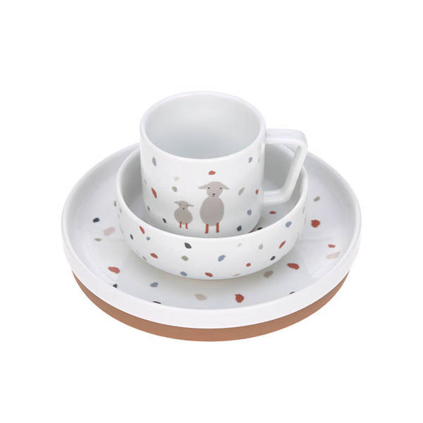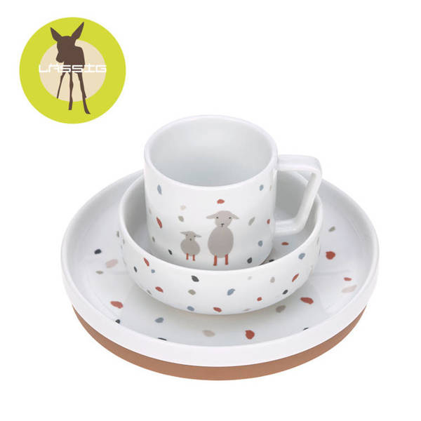 Komplet pięknych naczyń z porcelany niemieckiej marki LASSIG. W jego skład wchodzi spory talerz, miska i kubek z uchem. Zestaw jest biały w kolorowe drobne plamki (jak lastriko) z beżowymi gąskami na dnie miseczki, beżowymi owieczkami na dnie talerzyka oraz parami obu rodzajów zwierząt na kubeczku. Wykonany został z najwyższej jakości porcelany, odpornej na zadrapania i temperaturę, a ponadto nie absorbującej smaków i zapachów. Każdy element posiada zdejmowane silikonowe wykończenie na spodzie w kontrastowym kolorze terakoty, które zapewnia stabilność i zapobiega ślizganiu się naczyń po stole. Zestaw jest idealny dla dzieci powyżej 3. roku życia, które chcą już – jak dorośli – pić i jeść samodzielnie (co ułatwia im m. in. wyższy brzeg naczyń).