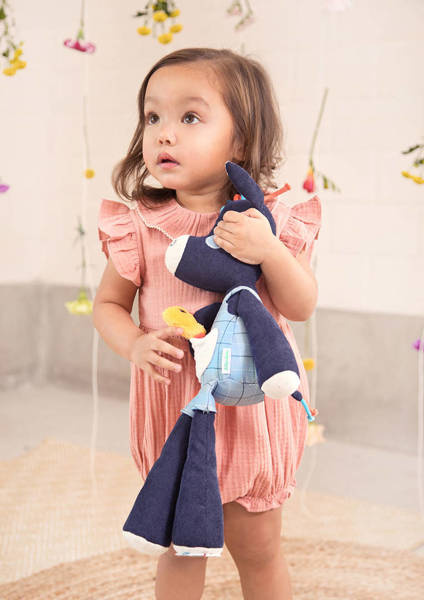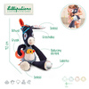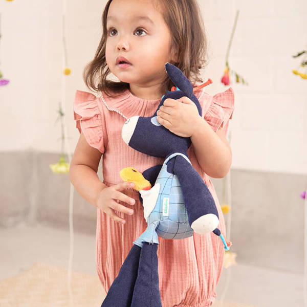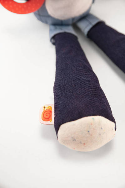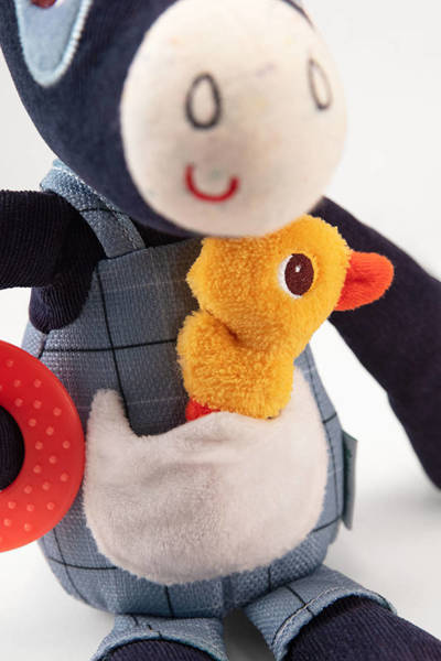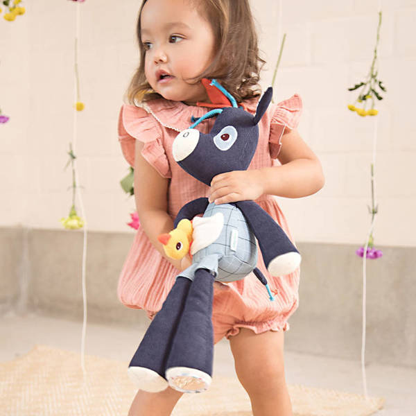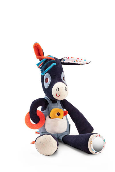 Przytulanka aktywizująca Osiołek Ignace belgijskiej marki Lilliputiens to niebanalne, miękkie i wielofunkcyjne źródło rozrywki i nauki dla ciekawskich maluszków. Ma postać rozbrykanego granatowego Osiołka Ignace'a w kraciastych ogrodniczkach, uszytego z materiałów o różnorodnej fakturze i wzorach. Przytulanka jest pełna niespodzianek. Ma długie sterczące uszy, które szeleszczą przy pocieraniu, grzywę i ogon ze sznureczków, a w jej główce znajduje się grzechotka. Prawa łapka stanowi poręczny uchwyt i jest wyposażona w okrągły fakturowany gryzaczek, prawa noga także szeleści, a na lewej znajduje się bezpieczne, giętkie lusterko. W kieszonce na brzuszku osiołka schowana jest mała kaczuszka na elastycznej tasiemce. Ponadto Osiołek posiada miękkie metki, które dodatkowo stymulują sensorycznie maluszka. Zabawka jest solidnie wykonana i w pełni bezpieczna. Zaskakuje i pobudza dziecięcą wyobraźnię. Rozwija małą motorykę (chwytanie, potrząsanie, wkładanie, wyciąganie), aktywizuje zmysł słuchu (szeleści, grzechocze), wzroku (lusterko) i dotyku (faktury tkanin), a dzięki gryzakowi – przynosi ulgę w trudnym okresie ząbkowania.