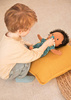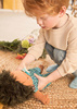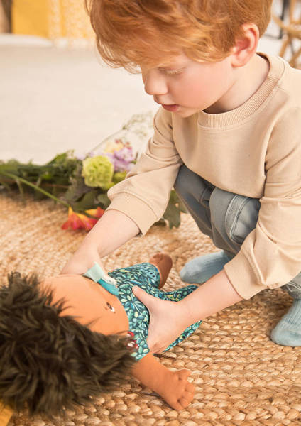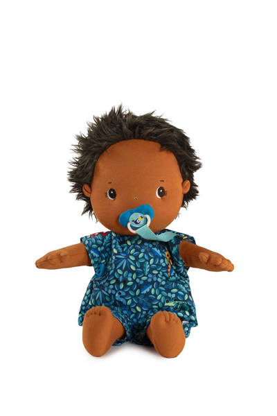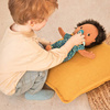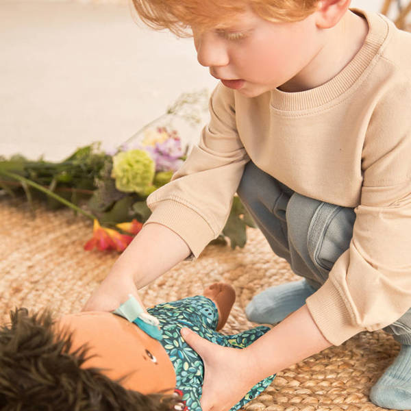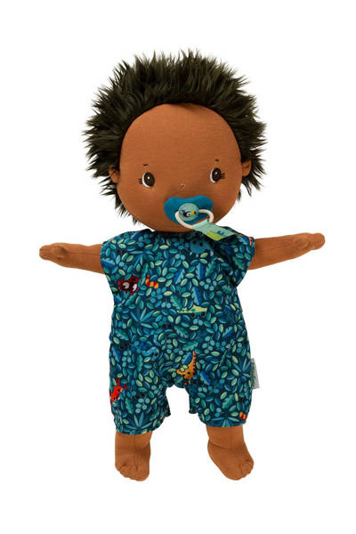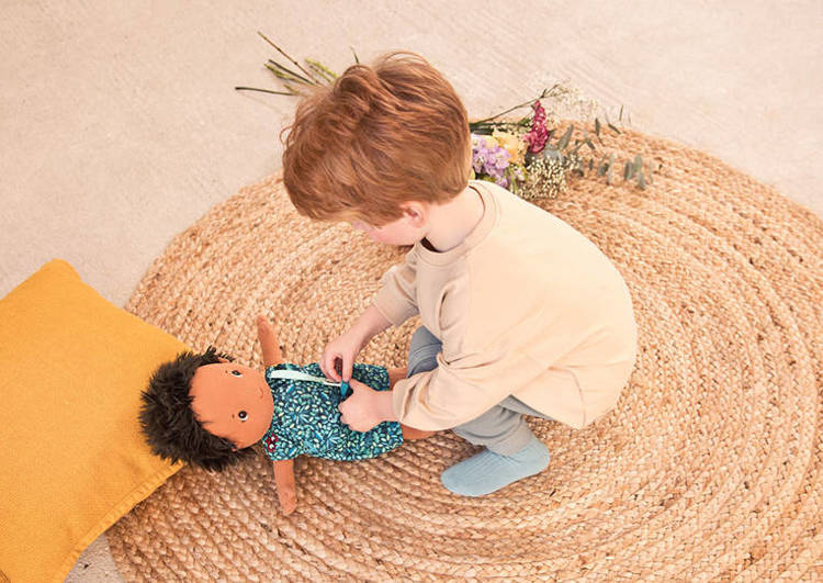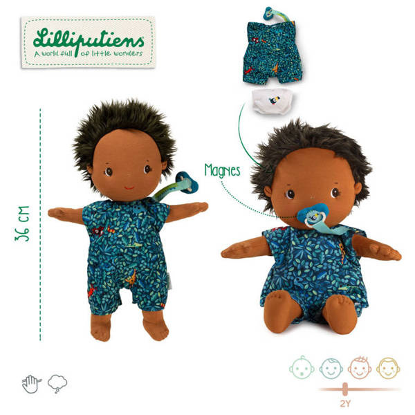 Lalka dzidziuś Sasha belgijskiej marki Lilliputiens jest idealna do tulenia, usypiania, uspokajania, zabierania na spacer czy zabawy w dom. Lalka jest duża – ma aż 36 cm wzrostu, a do tego perfekcyjnie wykończona, z dbałością o każdy szczegół i bezpieczna dla dziecka: oczy i buzia lalki są wyszywane, u rąk i nóg ma paluszki, na brzuszku pępuszek, a na głowie zabawnie zmierzwione dłuższe ciemne włoski. Lalkę można sadzać i przebierać. Ma zdejmowany rampers w botaniczny wzór z ukrytym między liśćmi Lemurem Georgem, pieluszkę i zawieszkę ze smoczkiem, który – dzięki magnesowi – można umieścić przy jej ustach. Zabawka pozwala dziecku ogrywać role i oswajać codzienność, pomaga także w rozwoju empatii.