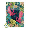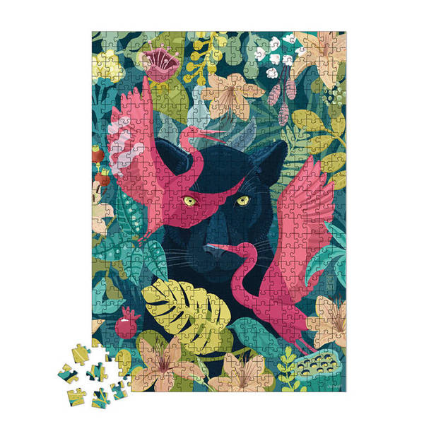 Puzzle artystyczne Mistyczna pantera francuskiej marki JANOD składają się z 500 elementów, które po ułożeniu tworzą piękną malarską grafikę: egzotyczną florę i faunę w oryginalnych barwach (m. in. zgaszonym różu, musztardowej żółci, oliwkowym czy nasyconym turkusie) z magnetyczną czarną panterą, umieszczoną centralnie w tle. Gotowa ilustracja ma wymiary 48 x 34 cm, a po oprawieniu w ramę może stanowić zachwycają dekorację dziecięcego pokoju lub innego miejsca w domu. Zwłaszcza, że tematyką, kolorystyką i designem doskonale wpisuje się w najnowsze trendy wnętrzarskie.