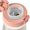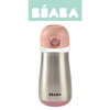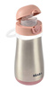 Pojemna (350 ml), poręczna i lekka butelka francuskiej marki BEABA przeznaczona jest dla dzieci od 18. miesiąca życia. Wykonana została ze stali nierdzewnej, odpornej na korozję, zarysowania, wgniecenia i zanieczyszczenia. Dzięki podwójnym stalowym ściankom, butelka długo zachowuje temperaturę napojów, zarówno ciepłych (do 6h), jak i zimnych (do 7h). Ergonomiczny kształt, wygodny dla małych rączek i dodatkowy zdejmowany uchwyt ułatwiają samodzielne trzymanie w jednej dłoni. Wewnętrzny otwór butelki posiada wyższą profilowaną szeroką silikonową osłonkę z zaworem, który zamyka się automatycznie wraz z zamknięciem klapki, dzięki czemu nic się nie wylewa. Osłonka ta ułatwia także naukę samodzielnego picia z butelki. Zintegrowana klapka na klik jest szczelna, bezpieczna i higieniczna, a przy tym łatwa do samodzielnego otwierania i zamykania przez dziecko.