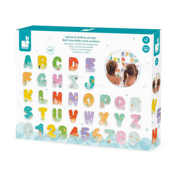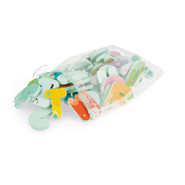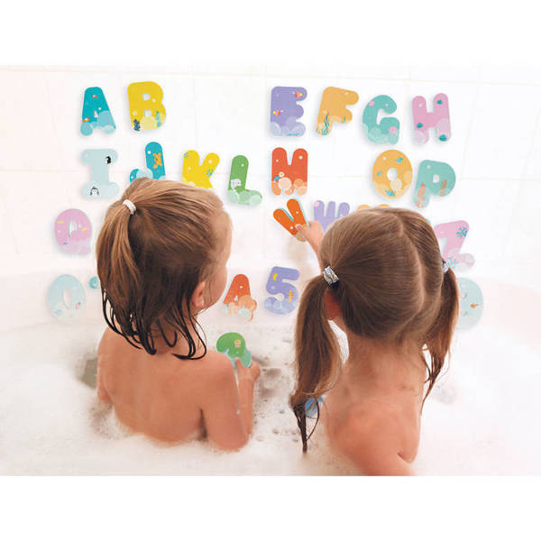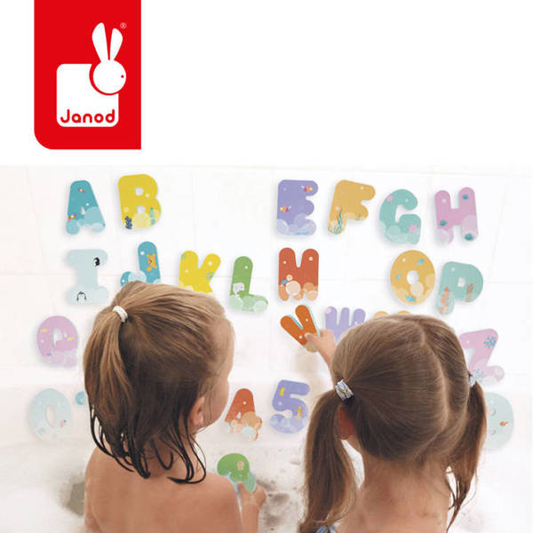 Literki i cyferki do kąpieli francuskiej marki JANOD to aż 26 liter i 10 cyfr z wodoodpornej pianki EVA w pięknych pastelowych kolorach z uroczymi morskimi grafikami. Elementy są mają spore, poręczne rozmiary – 5,5 x 7,7 cm każdy, unoszą się na powierzchni wody, a po zamoczeniu – bez trudu trzymają się wanny lub płytek w łazience. To doskonały umilacz czasu, spędzanego w kąpieli, a przy tym niebanalna zabawka edukacyjna, oswajająca dziecko z alfabetem i cyferkami. Do zestawu dołączona jest zaciskana na sznurek siatka z przyssawką dla łatwiejszego przechowywania i zachowania porządku.