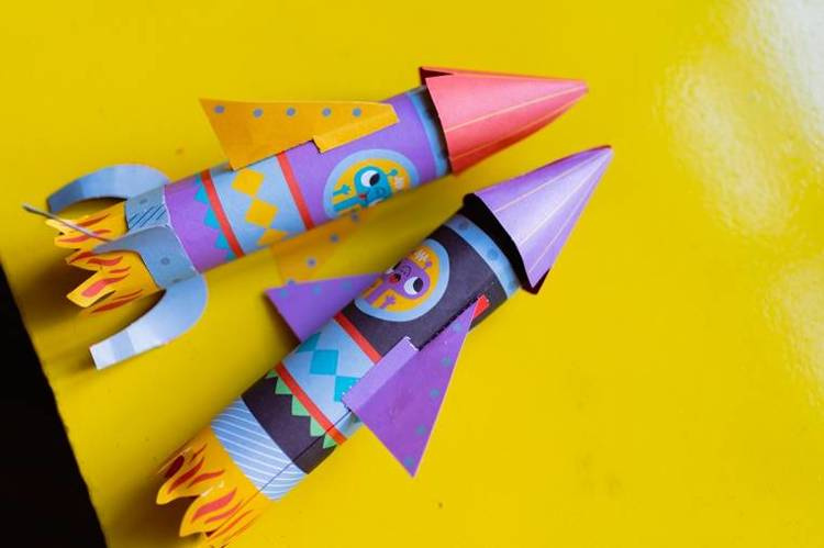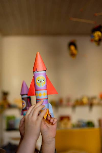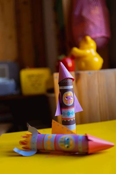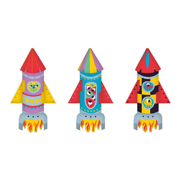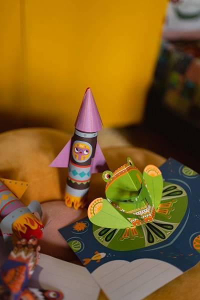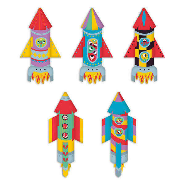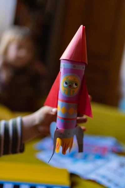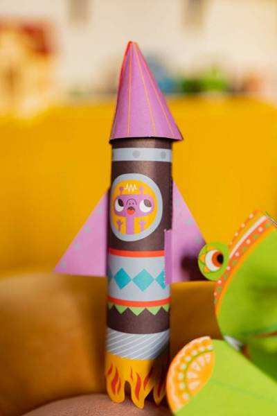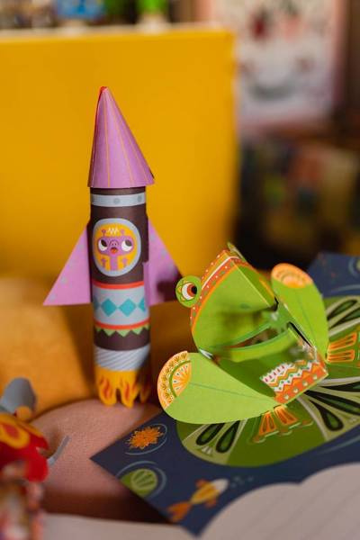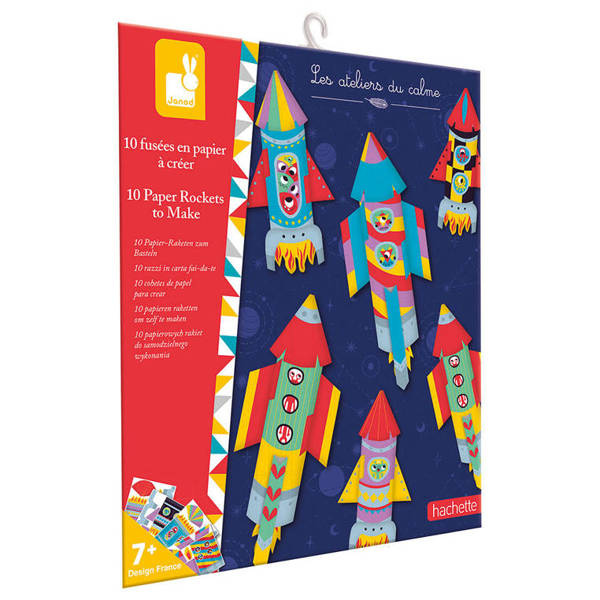 Zestaw kreatywny Papierowe rakiety z wyrzutnią francuskiej marki JANOD pozwoli stworzyć łącznie 10 rakiet kosmicznych. W jego skład wchodzi 10 arkuszy z wstępnie wyciętymi częściami, z których należy złożyć rakiety 3D. Na arkuszach nadrukowane są nie tylko wzory, ale też ich piloci i pasażerowie, np. ufoludki. W komplecie znajduje się też arkusz do złożenia w stanowisko startowe – wyrzutnię oraz gumka, którą trzeba przy nim zamocować. Na stanowisku umieszcza się wybraną rakietę, wraz z nim napręża się gumkę jak w łuku, a po jej puszczeniu – rakieta zostaje wystrzelona i leci w kosmos. Tworzenie zabawek z papieru to długie godziny angażującej i jednocześnie uspokajającej, wyciszającej aktywności, a zabawa gotową flotą to emocjonująca rozrywka dla kilkorga dzieci, a nawet dorosłych. Do zestawu dołączona jest szczegółowa instrukcja.
