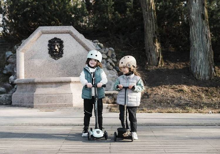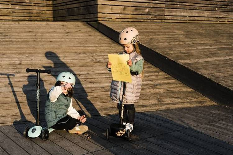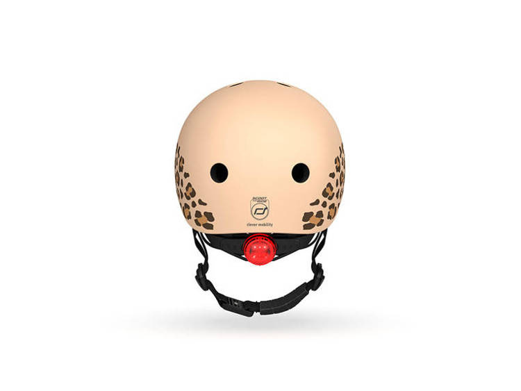 - kask jest spójny kolorystycznie z hulajnogą Highwaykick 2 Lifestyle Leopard – po bokach jasnobeżowej skorupy, znajduje się beżowo-brązowy wzór w lamparcie cętki