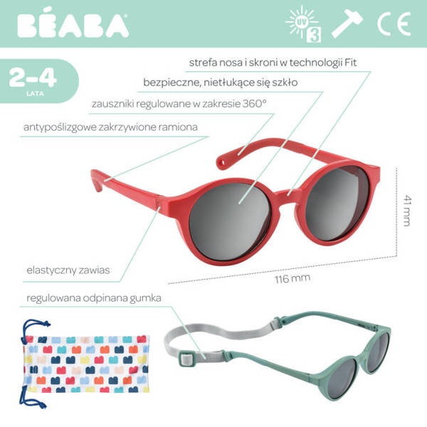 Okulary przeciwsłoneczne francuskiej marki BEABA przeznaczone są dla dzieci powyżej 2. roku życia Zaprojektowane z naciskiem na praktyczność, bezpieczeństwo i wygodę użytkowania, a przede wszystkim ochronę oczu malucha. Antypoślizgowe, zakrzywione ramiona nie uciskają głowy dziecka, są dobrze dopasowane i pozostają na miejscu, również podczas typowych dziecięcych aktywności. Strefa nosa i skroni wykonana została w technologii Fit z elastycznego, trwałego tworzywa, które dopasowuje się do kształtu twarzy. Szczególny, obły kształt oprawek zabezpiecza oczy malucha przed promieniami słonecznymi wpadającymi również z boku. Specjalne, nietłukące się „szkiełka” to ciemne soczewki kategorii 3, tj. gwarantujące maksymalną, 100% ochronę przed promieniami UV. Nadają się do ekspozycji na słońce również na plaży czy w górach. Okulary posiadają regulowane zauszniki 360° oraz elastyczną opaskę, którą można w razie potrzeby zamocować na klik (dzięki silikonowym zaczepom) dla optymalnego komfortu.