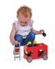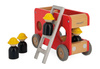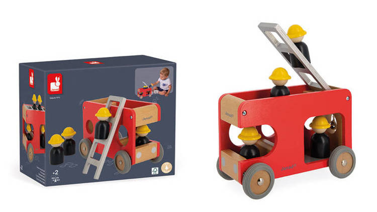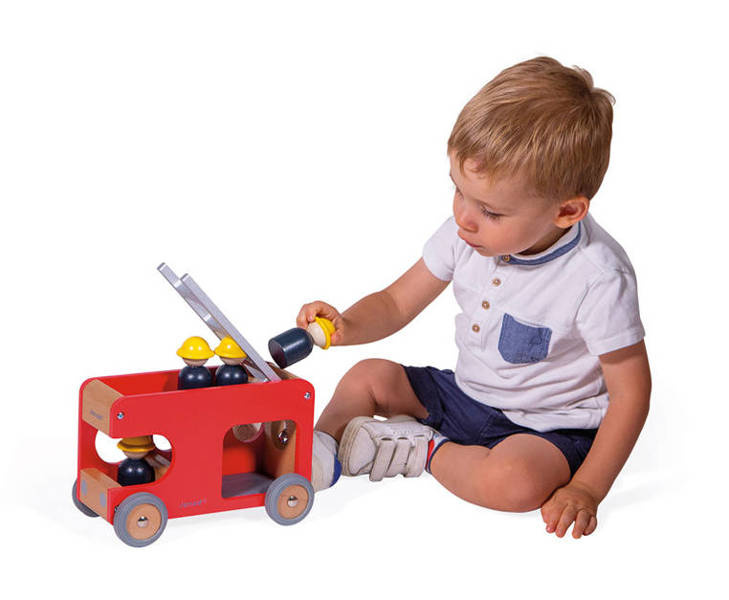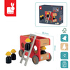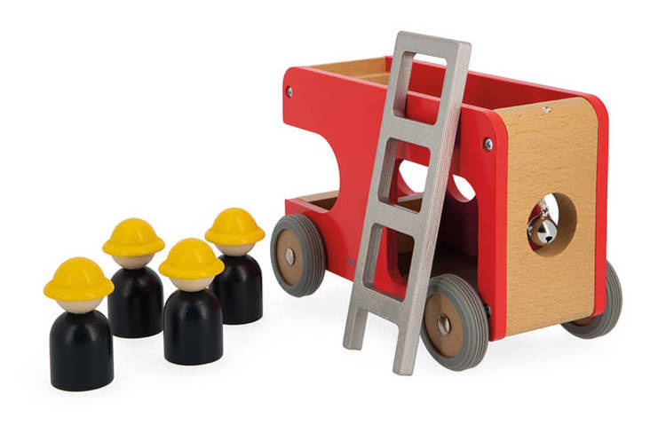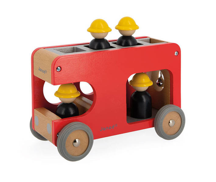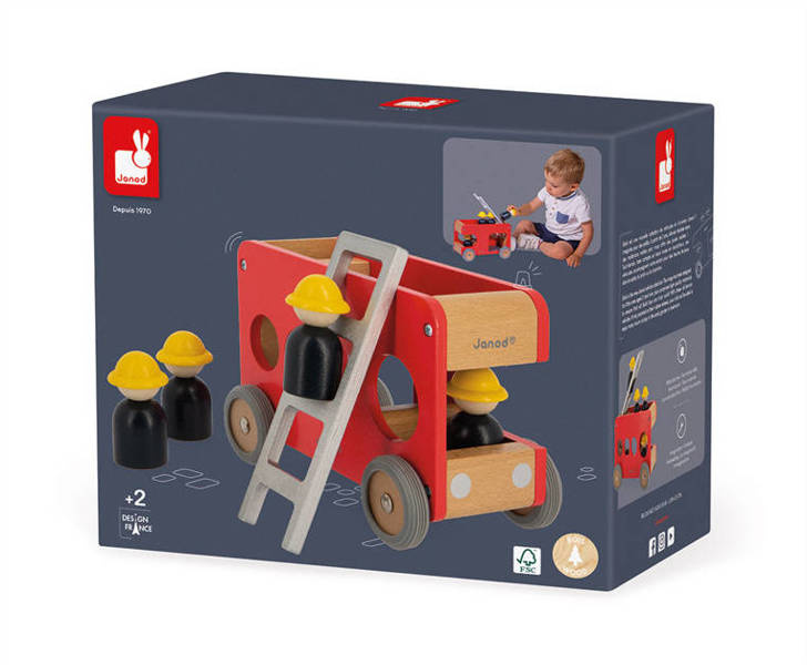Drewniana straż pożarna z serii Bolid francuskiej marki Janod to świetna zabawka dla małych fanów motoryzacji i nie tylko. Zestaw składa się z piętrowego wozu strażackiego z demontowaną drabiną i 4 strażaków (czarne figurki w żółtych kaskach). Pojazd ma kolor czerwony, naturalnego drewna i szarości. Koła mają solidne metalowe osie i wykończone są gumą, aby nie rysowały powierzchni w domu. Kształty są zaokrąglone i bezpieczne dla dzieci. Elementami zestawu można się również bawić oddzielnie. Zabawka stanowi część większej kolekcji Bolid.