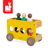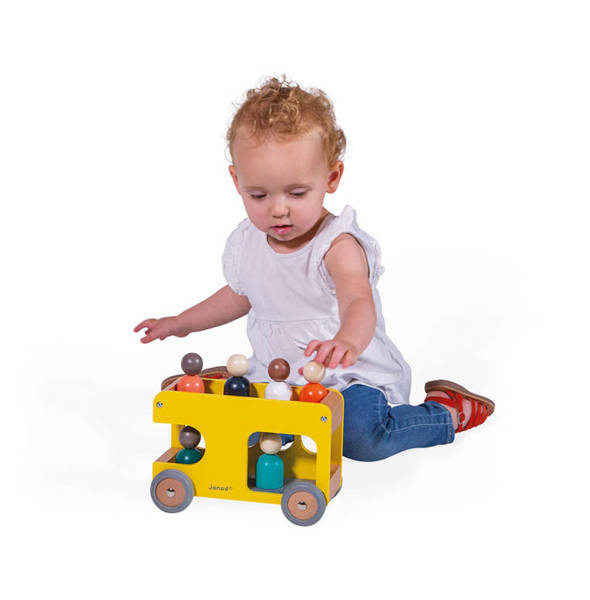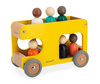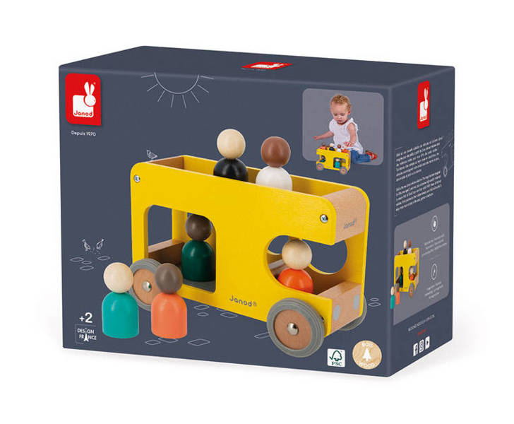 Drewniany autobus szkolny z serii Bolid francuskiej marki Janod to świetna zabawka dla małych fanów motoryzacji i nie tylko. Zestaw składa się z piętrowego autobusu z miejscami dla kierowcy i pasażerów, utrzymanego w kolorach naturalnego drewna, szarości i żółci oraz 6 wielobarwnych postaci (figurek z okrągłymi głowami). Koła mają solidne metalowe osie i wykończone są gumą, by nie rysowały powierzchni w domu. Kształty są zaokrąglone i bezpieczne dla dzieci. Elementami zestawu można się również bawić oddzielnie. Zabawka stanowi część większej kolekcji Bolid.