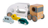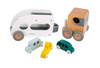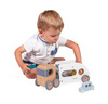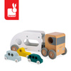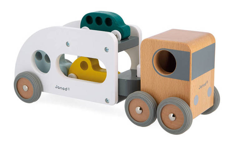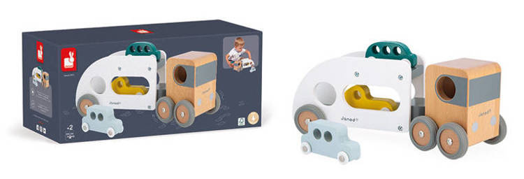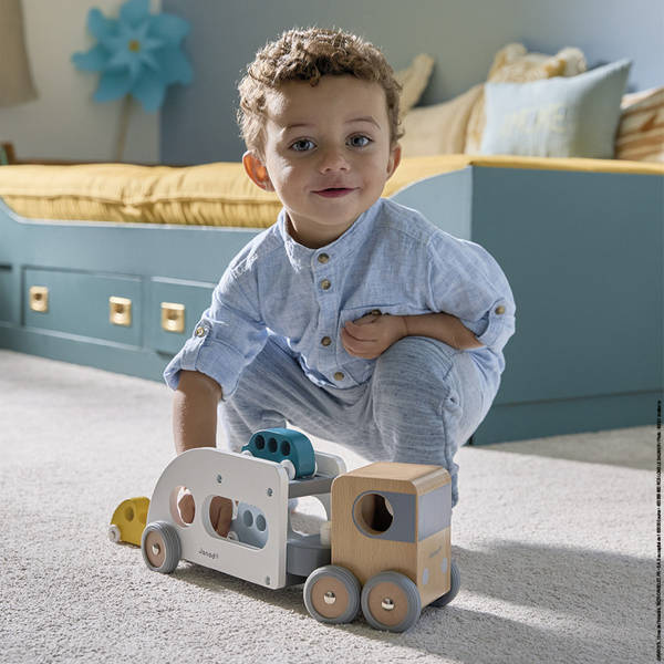 Drewniana laweta z serii Bolid francuskiej marki Janod to świetna zabawka dla małych fanów motoryzacji i nie tylko. Zestaw składa się z dwuczęściowej lawety (ciągnik z kabiną kierowcy + naczepa) oraz 3 pojazdów, które może przewozić. Ma piękne jasne kolory – naturalnego drewna, bieli, szarości, żółci i odcieni niebieskiego. Koła wszystkich samochodów mają solidne metalowe osie i wykończone są gumą, aby nie rysowały powierzchni w domu. Ich kształty są zaokrąglone i bezpieczne dla dzieci. Elementami zestawu można się również bawić oddzielnie. Zabawka stanowi część większej kolekcji Bolid.