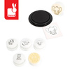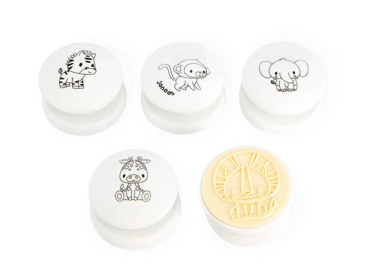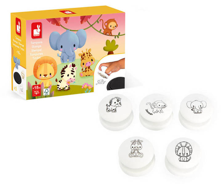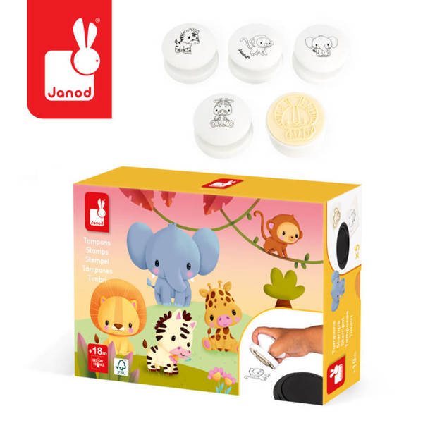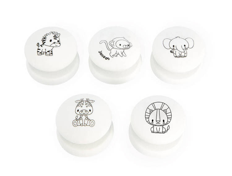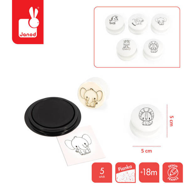 Zestaw kreatywny Stempelki Sawanna francuskiej marki JANOD zawiera 5 sporej wielkości poręcznych stempelków z uroczymi grafikami: zebrą, małpką, słoniem, żyrafą i lwem. Z ich pomocą można ozdabiać wybrane powierzchnie, tworzyć ciekawe historie czy kolorować odbite obrazki. Białe okrągłe uchwyty stempelków wykonane są z drewna i są przyjemnie zaokrąglone. W komplecie znajduje się też poduszeczka z czarnym tuszem. Stemplowanie to dla dziecka wiele długich chwil angażującej i jednocześnie uspokajającej zabawy. Zestaw zaprojektowano we Francji. Zapakowany jest w estetyczne kartonowe pudełko. Idealnie nadaje się na prezent.