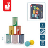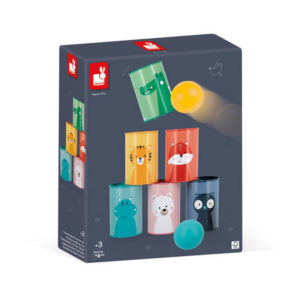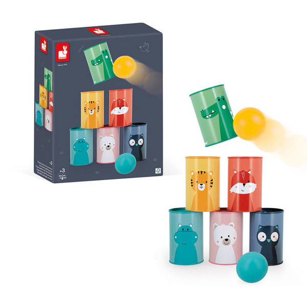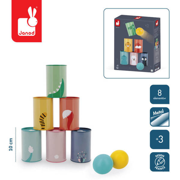 Gra w zbijanie metalowych puszek Zwierzątka francuskiej marki JANOD to doskonała zabawa dla całej rodziny. Puszki są kolorowe i zdobione postaciami krokodyla, lisa, tygrysa, hipopotama, sowy oraz niedźwiadka (z jednej strony puszki znajduje się przód zwierzątka, z drugiej – jego ogon). Układa się je w piramidę (wg schematu 3:2:1), a następnie celuje w nie z większej odległości dołączonymi do zestawu piankowymi piłkami (2 w zestawie). Celem gry jest przewrócenie/zbicie wszystkich puszek. To świetna gra zręcznościowa, idealna do zabaw plenerowych, np. na pikniki czy urodzinowe przyjęcia.