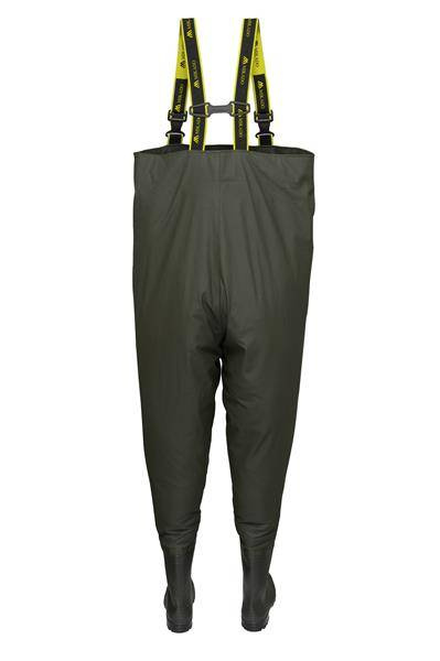 Spodniobuty wykonane z wysokiej jakości materiału poliestrowego. Nowoczesna technologia zgrzewania szwów, gwaratnuje stuprocentową wodoodporność i dużą odporność na uszkodzenia. Kalosze wyposażono w podeszwę z bieżnikiem, co gwarantuje dużą stabilność