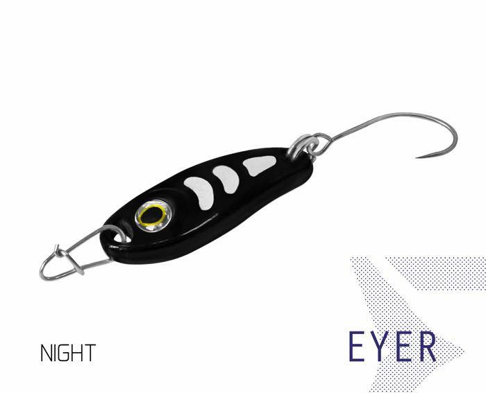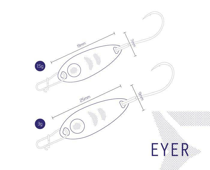 Delphin EYER to seria mikro wahadłówek przeznaczonych do połowu pstrągów. Ich korpus wykonany jest ze stopu cynku. Wyposażone są w wysokiej jakości pojedynczy haczyk z serii BOMB! Posiadają również HardLure i FASTLOCK MICRO SNAP, aby nie stracić żadnej ryby. Przynęty te są również bardzo skuteczne podczas łowienia małych ryb drapieżnych na jeziorach lub rzekach. Są one bardzo kuszące i atrakcyjne dla drapieżników, co widać na pierwszy rzut oka. Przynęty EYER są wyposażone w duże sztuczne oko, które doskonale imituje żywą przynętę.