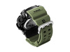 Gumowy pasek jest wygodny w dotyku i można go dopasować, co oznacza, że zegarek idealnie dopasowuje się do każdego nadgarstka. Ciemnozielony pasek pasuje do otoczenia. Koperta zegarka jest czarna i solidna, o dużej odporności na zewnętrzne uszkodzenia mechaniczne.