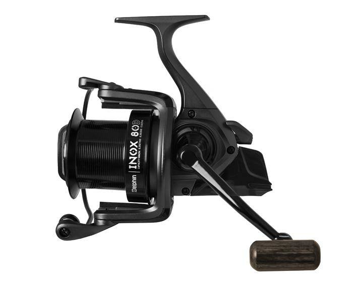 Delphin INOX reprezentuje serię kołowrotków karpiowych, które na pierwszy rzut oka zachwycają ciemnoszarym matowym wzorem z błyszczącymi czarnymi elementami. Poza tym ten elegancki design dopełnia precyzyjnie wykonana drewniana rączka, która doskonale leży w dłoni. Seria INOX występuje w dwóch wersjach pod nazwą 70D i 80D. Mniejszy brat ze znakiem 70D ma bardziej kompaktowe wymiary i mniejszą wagę, co predestynuje go szczególnie do połowów na mniejszych wodach. 80D to kołowrotek o dużej pojemności, który dzięki solidnej konstrukcji poradzi sobie nawet z najtrudniejszymi wyzwaniami podczas wypraw karpiowych. Posiada szpulę, która może pomieścić naprawdę dużą ilość żyłki i która umożliwia łowienie nawet na duże odległości, a także nadaje się do dalekich rzutów. Główną różnicą, poza wymiarami, jest konstrukcja korbki. 80D ma standardową konstrukcję uchwytu montażowego, w której oś jest prowadzona przez korpus kołowrotka i dokręcana śrubą po drugiej stronie. Rękojeść modelu 70D mocowana jest poprzez wkręcenie bezpośrednio w korpus kołowrotka, dzięki czemu nie ma żadnego swobodnego ruchu. W obu modelach znajduje się 6 + 1 łożysk kulkowych ze stali nierdzewnej, które zapewniają płynną i łatwą pracę. Obrotowy rotor kołowrotka zaopatrzony jest w niepozorne elementy, które służą jako zabezpieczenie przed wpadnięciem żyłki pod szpulę i jej zaplątaniem się. Oba modele posiadają system wolnej oscylacji tzw. „Slow oscillation”, która zapewnia dokładne ułożenie żyłki na szpuli. Dzięki tej funkcji znacznie łatwiejsze jest rozwijanie żyłki z kołowrotka podczas rzutu, co predysponuje je do dalekich rzutów. Elementy wewnętrzne wykonane ze stali nierdzewnej w połączeniu z odpornością na słoną wodę gwarantują długą żywotność i sprawiają, że kołowrotek sprawdza się nawet w najbardziej wymagających warunkach. Do pakietu podstawowego można dokupić zapasową szpulę głęboką i płytką.