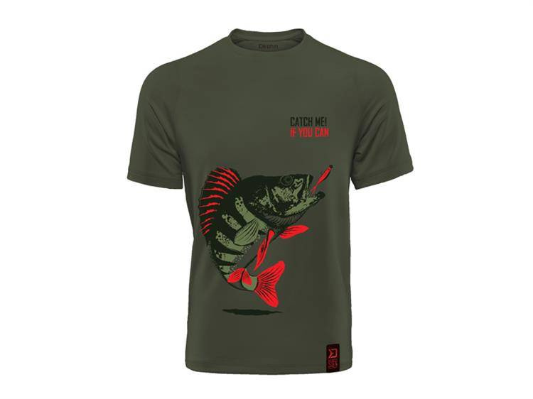 Koszulka Catch me! Okoń zaprojektowana jest w ciemnozielonym kolorze z wizerunkiem okonia właśnie podpływającego do przynęty, czyli momentu, na który czekają wszyscy miłośnicy łowienia tych ryb.