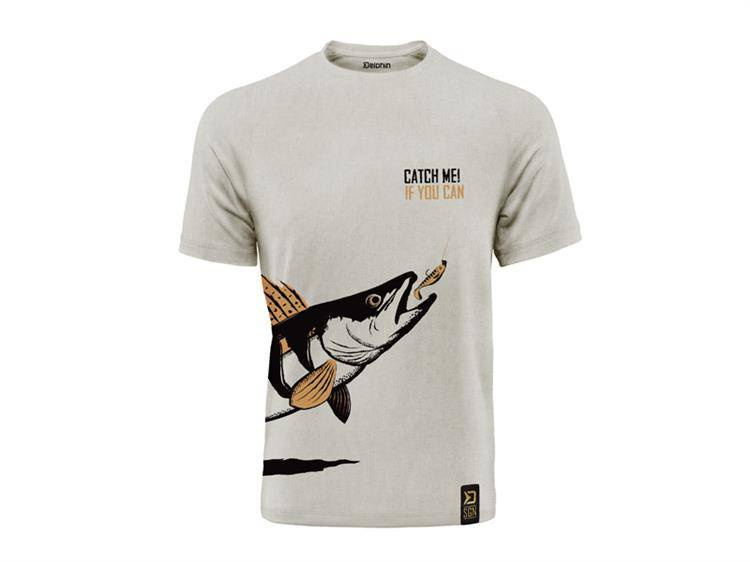 Koszulka Catch me! Sandacz zaprojektowana jest w kremowym kolorze z wizerunkiem sandacza właśnie podpływającego do przynęty, czyli momentu, na który czekają wszyscy miłośnicy łowienia tych ryb.