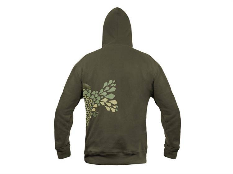 Wykonana jest z ciemnozielonego materiału, który doskonale komponuje się z naturalnym otoczeniem. Przedstawiony na bluzie motyw karpiowy składa się w całości z poszczególnych elementów montażowych zestawu karpiowego. To sprawia, że Delphin TACKLE jest rozpoznawalnym i naprawdę wyjątkowym elementem wśród odzieży dla karpiarzy. W przedniej części posiada dwie kieszenie, które pozwalają ogrzać dłonie w chłodne dni, ale także przechowywać i przenosić różne rzeczy.