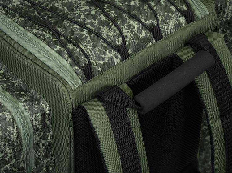 Dwie duże kieszenie po bokach i mniejsza z przodu. Na górze plecak posiada gumowy pasek do mocowania kurtki, bluzy lub składanej maty. CARPER posiada wysokiej jakości zamki i ściągacze z logo Delphin.
