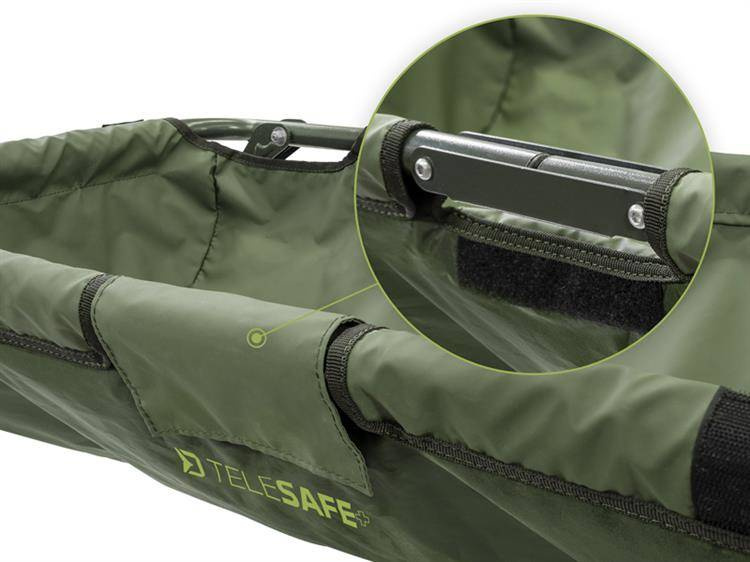TeleSAFE+ posiada również pokrowiec mocowany na zamek błyskawiczny z rzepem. Dzięki niemu możesz bezpiecznie trzymać rybę w środku, podczas gdy Ty przygotowujesz aparat lub nabierasz wodę, aby polać rybę. Specjalne teleskopowe nóżki kołyski zabezpieczą ją przed utknięciem w błocie. Kolejną mocną stroną tego produktu jest łatwy transport. Konstrukcja jest podzielona w środku, więc bardzo łatwo jest ją złożyć na pół i przenosić.