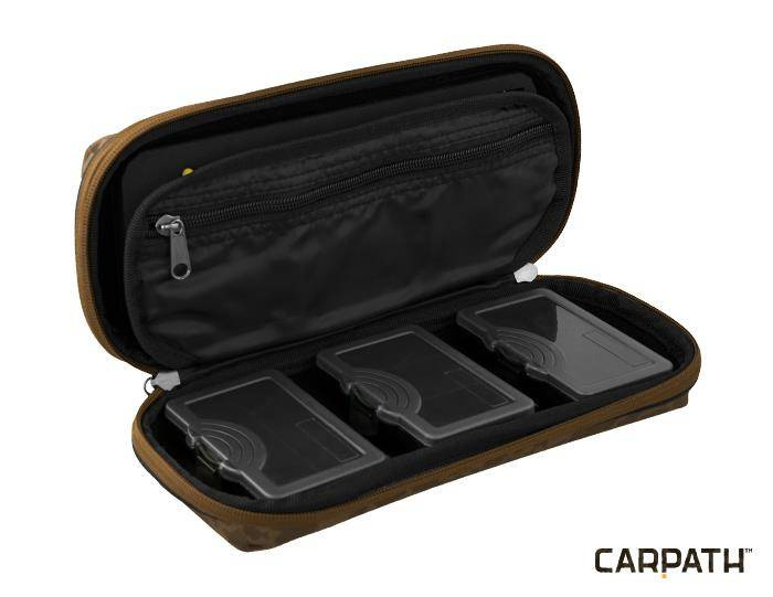Luksusowy futerał na przypon karpiowy, które spełni nawet najbardziej wymagające oczekiwania. Futerał jest sztywny a jego zawartość zupełnie bezpieczna. Posiada uchwyt do transportu. Otwiera się za pomocą mocnych zamków błyskawicznych. Wewnątrz jest podzielony na trzy części. Część górna jest wypełniona pianką (26x10x1cm). Jest przeznaczona na przypony. Mocowanie jest proste,za pomocą 10 pinów z okrągłą główką. Część dolna zawiera 3 małe pudełeczka na biżuterię wędkarską. Każde pudełeczko ma wymiary 10x7x2,5cm. Ostatnia, trzecia część znajduje się po środku, ma wszytą kieszonkę na zamek błyskawiczny. Można w niej przechowywać nożyczki, lub inne narzędzia do montażu przeponów. Najwyższej jakości model jest dostępny za bezkonkurencyjną cenę.