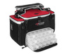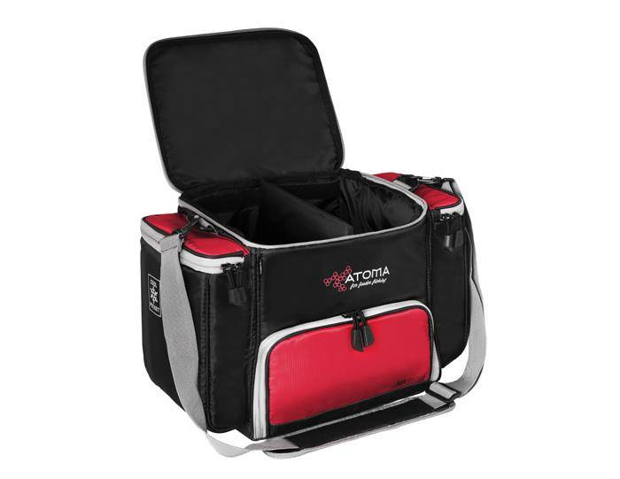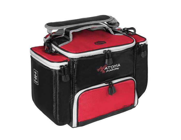Specjalne torby feederowe z serii ATOMA zostały opracowane w oparciu o konsultacje z Jakubem Šabatem, który jest również czeskim mistrzem w połowie techniką feeder. Torba jest bardzo praktyczna dzięki swoim kompaktowym wymiarom. Jednak łączy w sobie wszystko, co dobra torba feederowa powinna mieć. Górna część jest otwierana zamkiem błyskawicznym. Komora górna ma przegrodę, której pozycję można zmieniać i mocować rzepem. Pod komorą górną jest komora gówna. Jest otwierana z przedniej strony torby. Znajdziemy tu 3 praktyczne plastikowe pudełka na różne akcesoria wędkarskie. Torba posiada po bokach pakowne kieszonki. Jedna z nich jest z termoizolacyjną warstwą, co umożliwia schowanie w niej żywej przynęty. W celu dłuższego utrzymania niższej temperatury należy do kieszonki włożyć np. wkład z lodówki turystycznej. Zamiast przynęty można do niej schować także np. schłodzoną puszkę piwa. Druga boczna kieszonka o klasycznej budowie jest przeznaczona do przechowywania mniejszych akcesoriów. Torbę można nosić ATOMA w ręce praktycznym uchwytem lub przerzucić przez ramię na pasku, który automatycznie znajduje się w komplecie. Torbę cechuje wykonanie wysokiej jakości, masywne zamki błyskawiczne z plastikowymi językami. Do torby ATOME można dokupić dodatkowe pudełka (Delphin B-06).