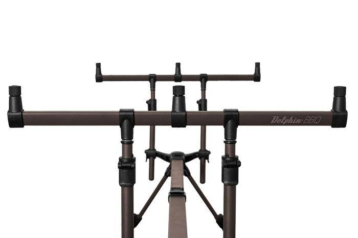 Wyjątkowy model rod poda, który łączy w sobie nieskończenie wiele modyfikacji wymiarowych. W porównaniu z klasyczną dwukierunkową regulacją nóg w lub wysokością samych buzz barów, stojak ten posiada dodatkowo możliwość przesuwania osiowego nóg. Dzięki temu użytkownik może przenieść swoją bazę wszędzie tam, gdzie mu odpowiada, w zależności od terenu. Istnieje również możliwość regulacji długości rod poda. Model do BBQ jest bardzo stabilny a każdy jego szczegół jest doskonale opracowany. Podstawa szkieletu wykonana jest z profili aluminiowych łączonych za pomocą mocnego tworzywa ABS. Każdy element konstrukcji został przetestowany pod kątem wielu cykli otwierania / zamykania. Niezwykle długie nogi teleskopowe są również niekonwencjonalne, dzięki czemu model ten m można podnieść o poziom wyżej w porównaniu do standardowych modeli. Dzięki swojej wszechstronności wymiarowej można z niego zrobić niski, kompaktowy stojak. Model BBQ cechuje bardzo niska waga i idealne wymiary transportowe. Częścią zestawu jest pokrowiec transportowy z piankowym wypełnieniem.