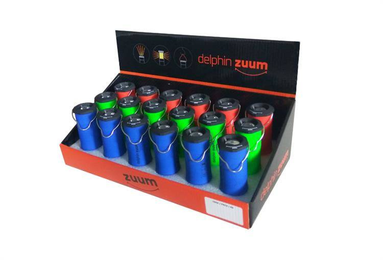 Delphin ZUUM jest dostarczana do sklepu w kolorowych wystawkach, z których każda zawiera 18 sztuk latarki-lampki (6x zielony, 6x pomarańczowy i 6x niebieski).