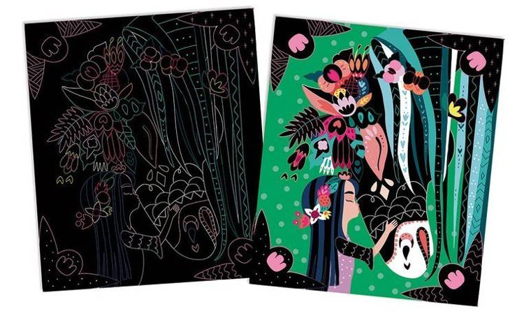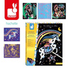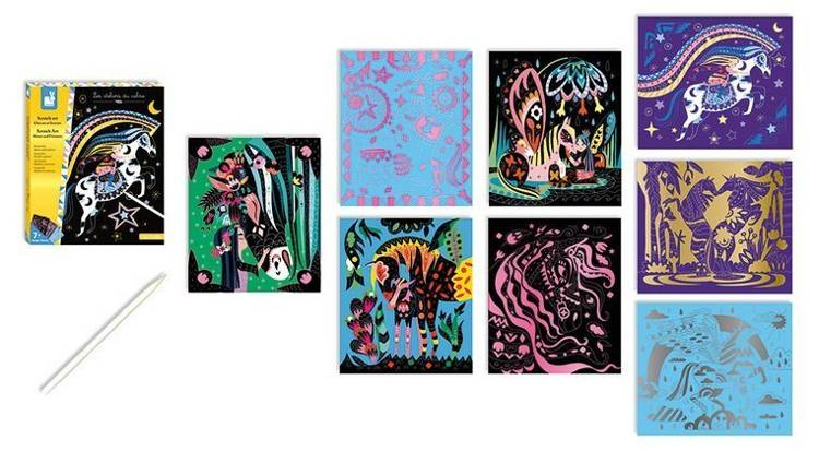 Zestaw kreatywny Do zdrapywania Konie i jednorożce francuskiej marki JANOD zawiera 8 plansz z solidnego kartonu, przedstawiających magiczne życie koni i jednorożców, m.in. podniebną podróż czy kąpiel w leśnym jeziorze. Obrazki są pokryte jednobarwną warstwą wierzchnią z konturami elementów, które ukazują się stopniowo w efekcie jej zdrapywania. Do zestawu dołączony jest plastikowy patyczek. Zdrapywanie to dla dziecka długie godziny angażującej i jednocześnie uspokajającej, wyciszającej zabawy, a gotowe dzieła mogą stać się wspaniałą dekoracją dziecięcego pokoju. Zestaw zaprojektowano we Francji we współpracy z francuską grupą mediową i wydawniczą Hachette. Zapakowany jest w stylowe kartonowe pudełko. Idealnie nadaje się na prezent.