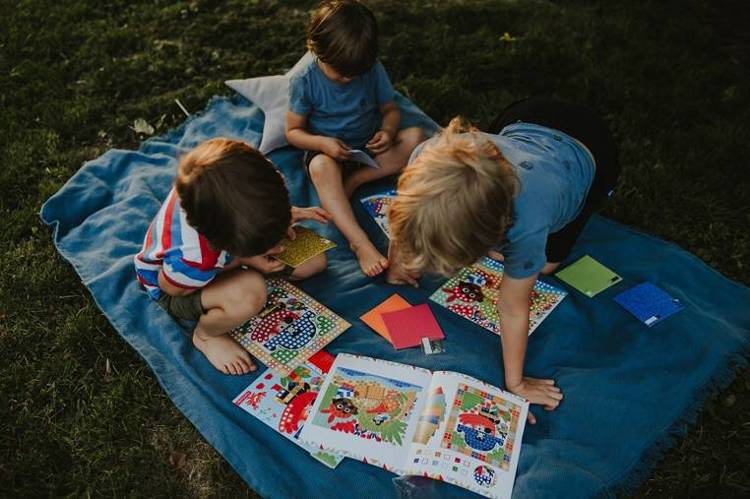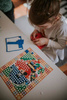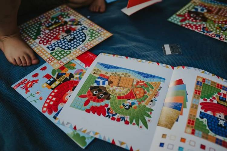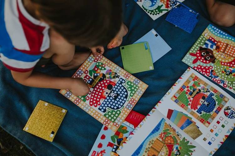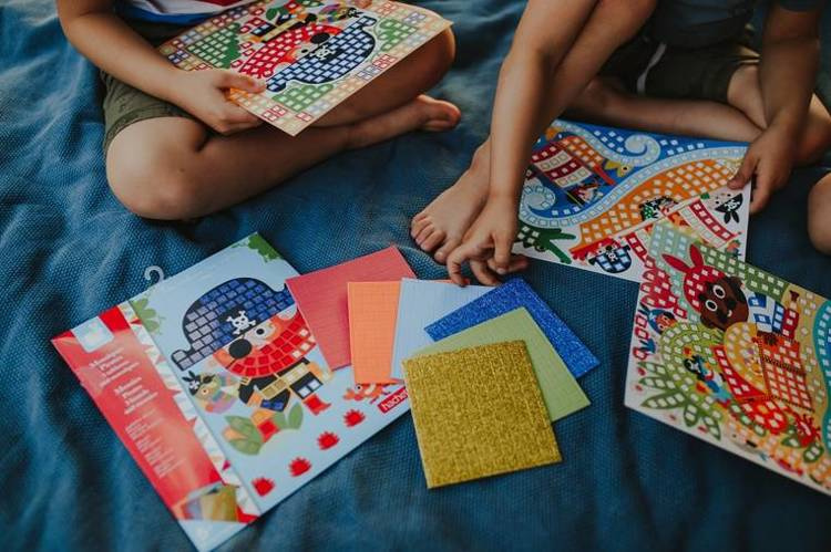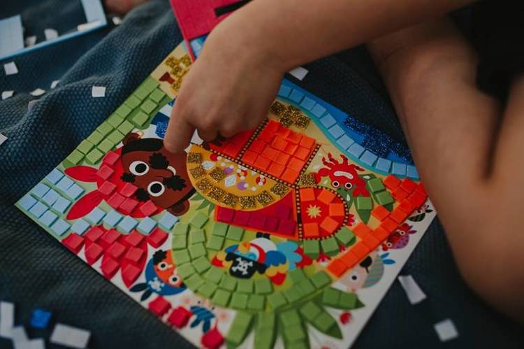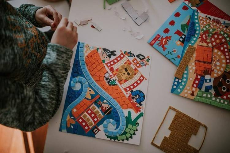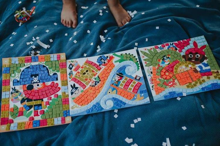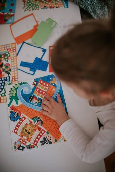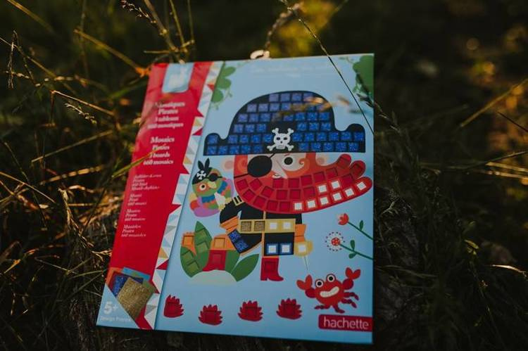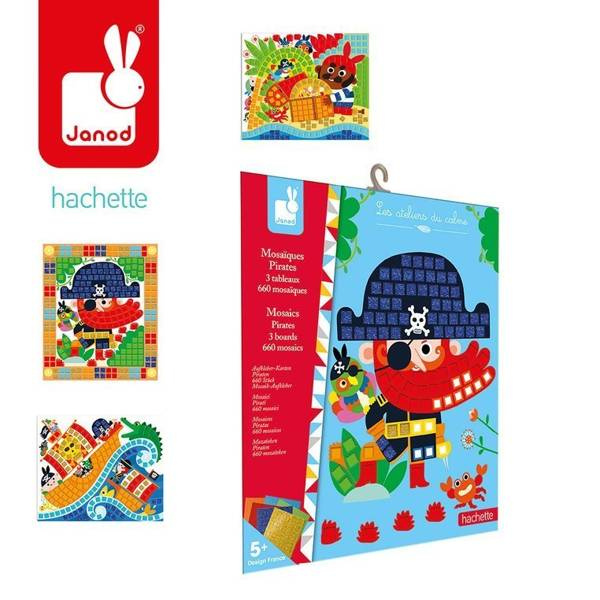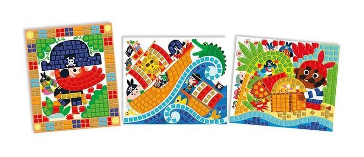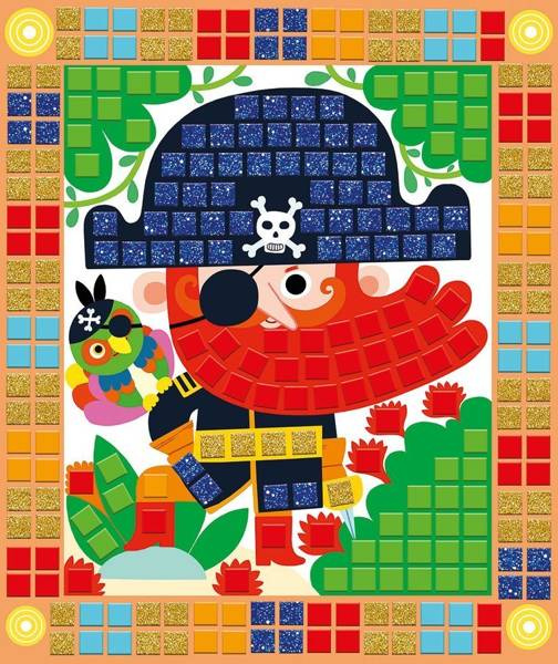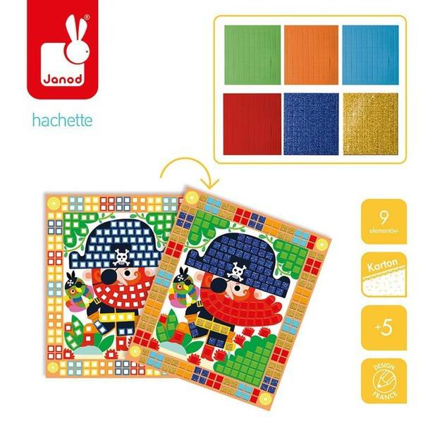 Zestaw kreatywny Mozaika Piraci francuskiej marki JANOD zawiera 3 kartonowe plansze-obrazki, które przedstawiają przygody piratów, m.in. sztorm na morzu i znalezienie skarbu na wyspie. Do ilustracji tych można – zarówno w sugerowanych miejscach, jak i dowolnie – przyklejać dołączone do zestawu drobne kwadratowe piankowe naklejki (ponad 700 sztuk!) w 6 różnych kolorach, w tym dwóch z efektem połysku (każdy na osobnym arkuszu). Naklejanie to dla dziecka długie godziny angażującej i jednocześnie uspokajającej, wyciszającej zabawy, a gotowe obrazki staną się wspaniałym elementem dekoracyjnym dziecięcego pokoju.