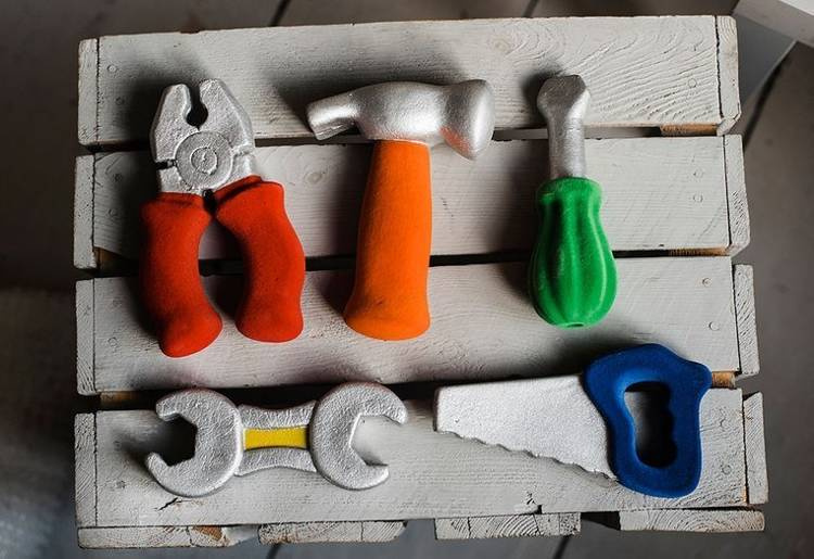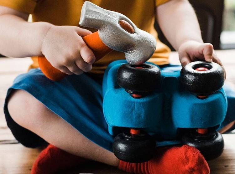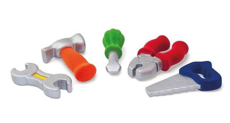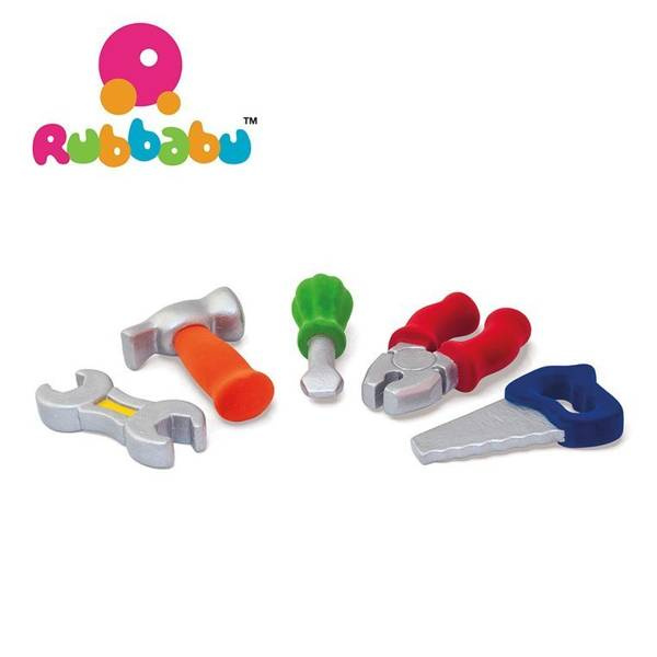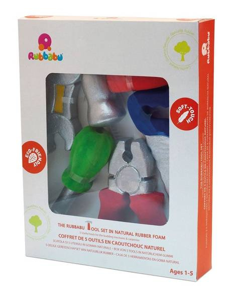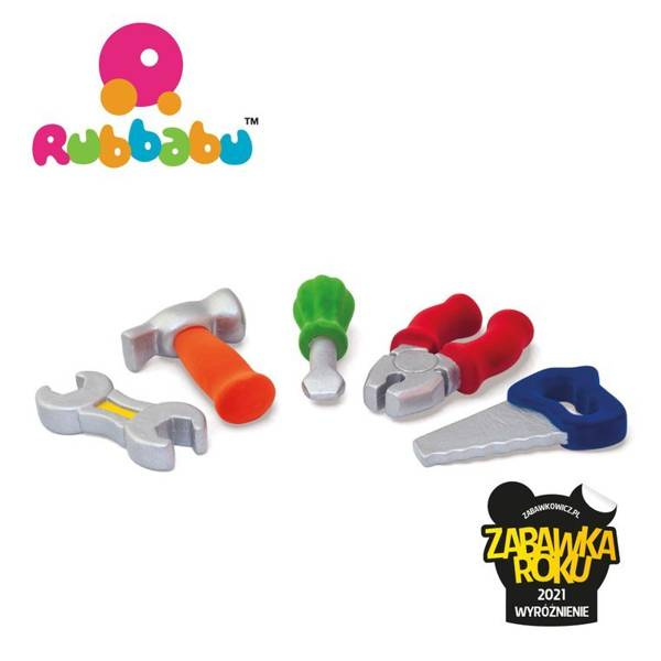 Zestaw narzędzi sensorycznych marki Rubbabu to doskonała, rozwojowa zabawka, rekomendowana dla dzieci od 1. roku życia. Składa się z 5 części: młotka, piły, kombinerek, klucza i śrubokrętu. Wyjątkowo miękkie i przyjemne w dotyku elementy mają jaskrawe kolory uchwytów (czerwony, pomarańczowy, zielony, ciemnoniebieski i żółty) i srebrną, połyskującą powierzchnię, imitującą metal. Kształtem naśladują one rzeczywiste „dorosłe” narzędzia. Dzięki prostej formie i stymulującej teksturze aktywizują dziecięcą wyobraźnię i zachęcają do gry, a ponadto są lekkie i bezpieczne, także dla niemowląt. Elementy można ściskać, ugniatać, rzucać, toczyć... Dla starszych dzieci zabawa narzędziami to z kolei lekcja naśladowania dorosłych, odgrywania ról społecznych oraz trening koordynacji ręka-oko.
