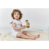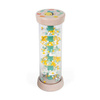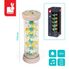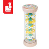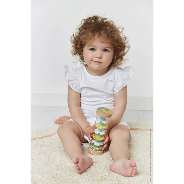 Kij deszczowy z serii Pure francuskiej marki JANOD to wielofunkcyjna zabawka, która rozwija u dziecka, m.in. wrażliwość muzyczną i poczucie rytmu, ćwiczy chwyt, małą motorykę, wzrok oraz koncentrację. Kij deszczowy to poręczna transparentna tuba, wypełniona drobnymi kolorowymi kuleczkami. Przechylanie lub potrząsanie instrumentem powoduje ich przesypywanie się, a odgłos, który wydają, imituje kojący dźwięk kropel, spadających na ziemię podczas deszczu. Zabawka jest estetycznie wykonana i ma piękne pastelowe kolory: jasnego drewna, bieli, niebieskiego i żółtego. Od góry i od spodu zdobią ją ilustracje sympatycznych zwierzątek: ptaszka i pszczółki. Może być ona świetnym pierwszym instrumentem i rodzajem oryginalnej grzechotki dla dziecka.