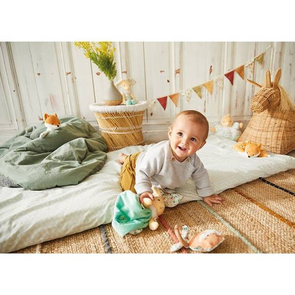 Uroczy komforter Lisek Leonard francuskiej marki KALOO to idealna zabawka dla Twojego dziecka, bezpieczna już od pierwszych dni życia. Jest niezwykle miękka, piękna i perfekcyjnie wykończona. Ma kształt rudej, puchatej, kwadratowej chusteczki z wzorzystymi łapkami i białym futerkowym brzuszkiem, słodki lisi pyszczek i długi, szeroki ogon. Komforter służy do tulenia, gryzienia rogów-łapek i uspokajania maluszka. Pomaga przy ząbkowaniu. Rozmiarami dopasowany jest do małych rączek, wspiera naukę chwytania. Ma haftowane oczy i buzię oraz ważkę na jednym z narożników.