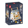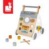 Drewniany wielofunkcyjny pchacz edukacyjny z serii Sweet Cocoon francuskiej marki JANOD to idealna zabawka dla dzieci od 1. roku życia. Ma bezpieczne zaokrąglone brzegi, wygodną rączkę i szeroko rozstawione, stabilne koła. Zachwyca estetyką wykonania i pięknymi, jakby „dorosłymi” kolorami. Wspiera dziecko w stawianiu pierwszych kroków, ale też w ogólnym rozwoju. Trzy ścianki pchacza stanowią przestrzeń dla: toru z trzema elementami - figurami geometrycznymi do przesuwania, metalowego drążka z 10 klockami – również do przesuwania, dwóch pokręteł, dwóch lusterek, sortera z 4 klockami o geometrycznych kształtach, trzech kółek zębatych i cymbałków z 4 klawiszami. Zabawka rozwija koordynację ruchową i małą motorykę, trenuje pamięć i logiczne myślenie, uczy rozróżniać kolory i kształty, a nawet zauważać zależności przyczynowo - skutkowe. Wiele różnorodnych funkcji sprawia, że nie nudzi się ona, a kolory (jasnego drewna, szarości i bieli z elementami pastelowej zieleni, odcieni niebieskiego, żółtego i pomarańczu) – zachwycają. Pchacz ma wygodny uchwyt na optymalnej dla dziecka wysokości i hamulec, który można zamontować lub zdjąć. Kółka zostały wykończone gumą, co zapewnia mu stabilność i sprawia, że nie rysuje on podłogi w domu. Ponadto można je w razie potrzeby odkręcić.