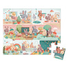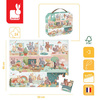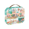 Zestaw puzzli w walizce Jeden dzień francuskiej marki JANOD składa się z 24 elementów, po ułożeniu tworzących piękny, bogaty w szczegóły trójdzielny obrazek, przedstawiający zajączki i ich aktywności, związane z kolejnymi porami dnia. Rano są to: pobudka, śniadanie, toaleta i ubieranie się, potem: nauka i zabawy na dworze, zaś po południu i wieczorem: czas wolny, kąpiel, kolacja i zasypianie. Gotowa ilustracja ma wymiary 50 x 40 cm.
