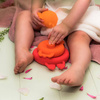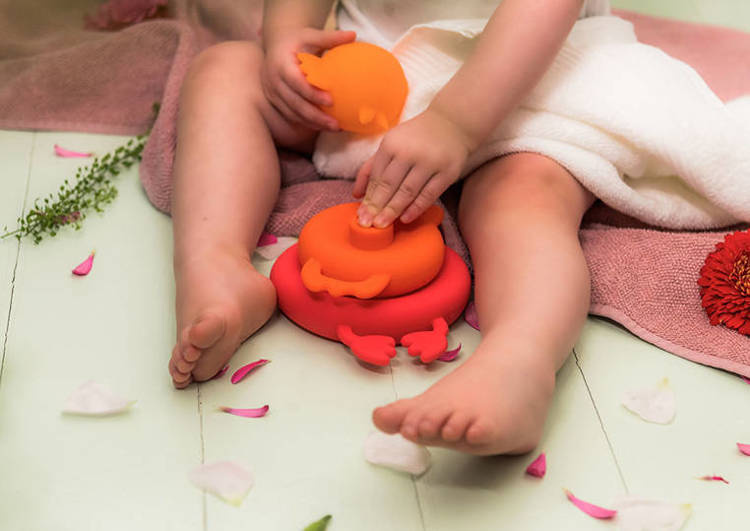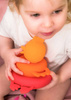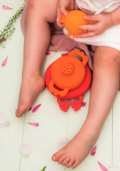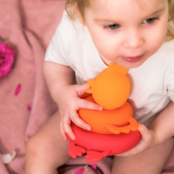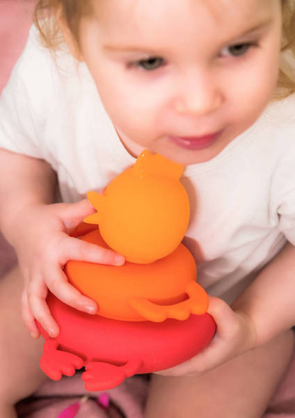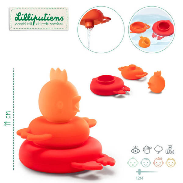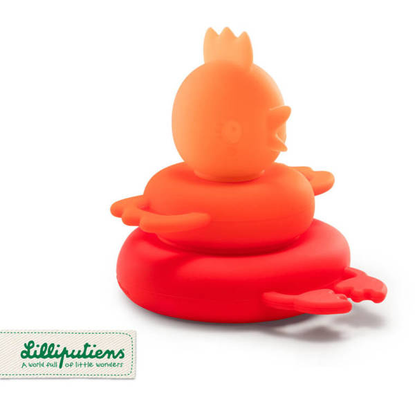 Piramida do kąpieli Kokoszka Paulette belgijskiej marki Lilliputiens została wykonana z łatwego do czyszczenia i szybkoschnącego silikonu. Kokoszka składa się z 3 części, które można ułożyć jedną na drugiej: pomarańczowej głowy z grzebieniem i dziobem, ciemniejszego tułowia ze skrzydłami-uchwytami i otworem do przelewania wody oraz czerwonego kuperka z wystającym ogonkiem i dwoma zabawnymi nóżkami – to największa część, która może pełnić rolę pojemnika na wodę. Wszystkie elementy mają zaokrąglone kształty, są lekkie i unoszą się na powierzchni. Zabawka jest perfekcyjnie wykończona, z dbałością o każdy szczegół i w pełni bezpieczna dla dziecka. Rozwija sprawność motoryczną i koordynację ręka-oko.