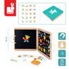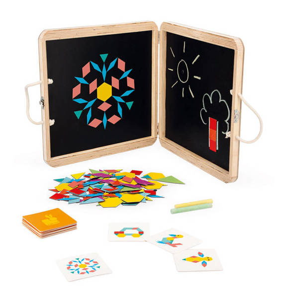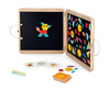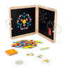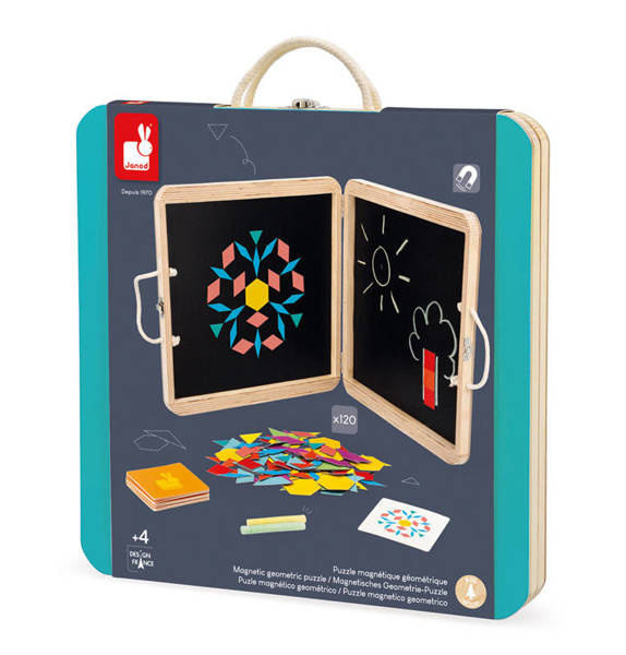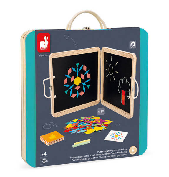 Magnetyczna układanka w drewnianej walizce z wizerunkiem kotka francuskiej marki JANOD to doskonała zabawka, rozwijająca kreatywność i wyobraźnię. W zestawie znajduje się 120 magnesów w geometrycznych kształtach i pięknych, intensywnych kolorach, które dziecko może układać na obu wewnętrznych ściankach walizki. Dodatkowo zawiera 20 kart z grafikami m.in. zwierząt do odtworzenia na planszy oraz kredę – ponieważ owe wewnętrzne ścianki mogą też pełnić rolę tablicy. Zabawka będzie służyć dziecku przed długi czas i nieprędko się znudzi, bo daje wiele możliwości kreacji. Jest pięknie wykonana, co rozbudza zmysł artystyczny, a ponadto trenuje spostrzegawczość oraz sprawność manualną u dziecka. To świetna rozrywka dla małych konstruktorów, a także wszystkich twórczych dzieci.