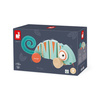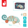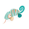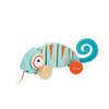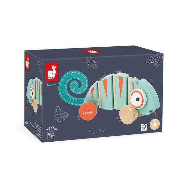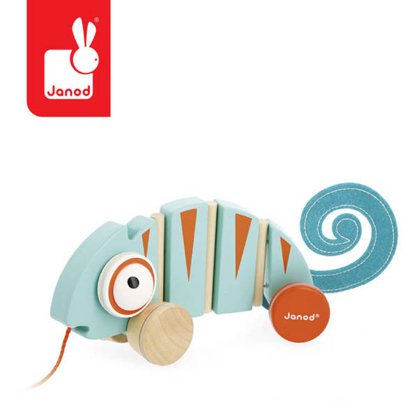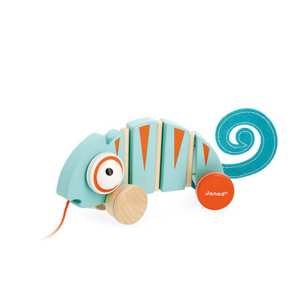 Drewniany kameleon do ciągnięcia serii Tropik francuskiej marki JANOD będzie świetnym towarzyszem pierwszych kroków dziecka. Jest estetycznie wykonany, ma piękne energetyzujące kolory: turkus z detalami w ciepłym odcieniu pomarańczu. Uroku dodają mu duże wypukłe oczy i filcowy zakręcony ogon. Podczas prowadzenia na sznureczku jego tułów, złożony z kilku części, wygina się, a szeroki rozstaw kół zapewnia zabawce stabilność. Co więcej, kółka wykończono gumą, dzięki czemu nie rysują podłogi w domu.