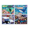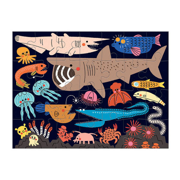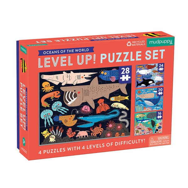 Puzzle progresywne Oceny świata amerykańskiej marki MUDPUPPY to zestaw 4 układanek o różnym stopniu trudności dla dzieci od 3. roku życia. Puzzle liczą sobie kolejno więcej elementów – 16, 20, 24 i 28, dzięki czemu dzieci stopniowo uczą się radzić sobie z coraz trudniejszymi układankami. Obrazki o rozmiarze 15 x 20 cm każdy, przedstawiają morskie stworzenia, w tym duże i małe ryby oraz podwodną roślinność na tle różnych odcieni wody – od jasno-błękitnej toni po niemal czarne głębiny. Gotowe ilustracje można potraktować jako pretekst do snucia barwnych opowieści o życiu w oceanie. Piękne kolory i sympatyczne (lub niekoniecznie) zwierzęta dodatkowo zachęcają do zabawy.