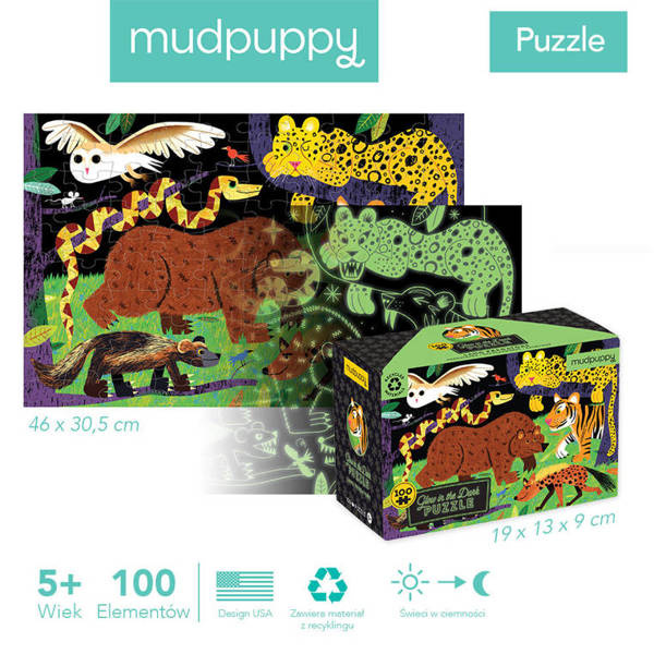 Puzzle świecące w ciemności Drapieżniki lądowe amerykańskiej marki MUDPUPPY nadają układaniu puzzli nowy wymiar – na samym złożeniu obrazka zabawa się bowiem nie kończy. Układanka składa się ze 100 elementów, po ułożeniu przedstawiających drapieżne stworzenia lądowe, m.in. niedźwiedzia, tygrysa czy anakondę. To jednak nie wszystko. Kiedy robi się ciemno zarówno te groźne zwierzęta, jak i otaczający je krajobraz... świecą! Puzzle te to niebanalny pomysł na rodzinną rozrywkę. Zaciekawią i zachwycą wszystkich.