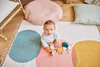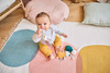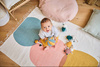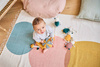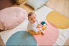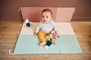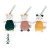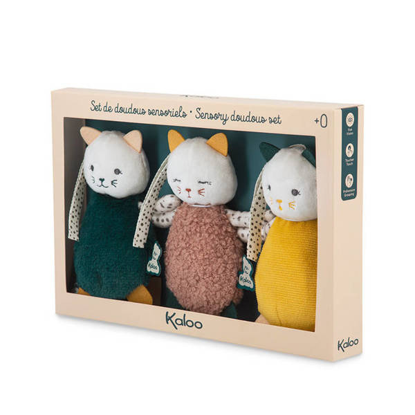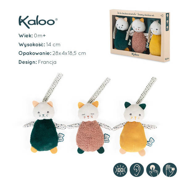 Komplet trzech uroczych przytulanek-zawieszek Koteczki z kolekcji Stimuli francuskiej marki KALOO to idealna, wielofunkcyjna zabawka rozwojowa dla Twojego dziecka, bezpieczna już od pierwszych dni życia. Kotki są miękkie, piękne i perfekcyjnie wykończone. Mają zaokrąglone ciała, odstające uszka, małe dolne łapki i dłuższe łapki górne z aksamitnej przyjemnej tkaniny w zabawny wzór w kropeczki. Kotki różnią się między sobą ciężkością (dzięki czemu maluszek uczy się podnosić przedmioty o różnej wadze), kolorami – granatowy, musztardowy i pudrowy róż (co stymuluje rozwój wzroku) oraz rodzajem futerka – jedno jest sztruksowe, drugie pluszowe i delikatne, trzecie pętelkowe i szeleści przy dotykaniu (to pobudza dotyk i słuch oraz oswaja z fakturami). Kotki mają haftowane oczka i pyszczki, a ich minki wyrażają różne emocje, które dziecko z czasem może również nauczyć się rozpoznawać, tj. radość, zdziwienie, senność. Każdy kotek posiada ponadto tasiemkę do przywiązania w wybranym miejscu, np. przy pałąku wózka lub szczebelkach łóżeczka. Rozmiarami dopasowane są do małych rączek, co dodatkowo wspiera naukę chwytania.
